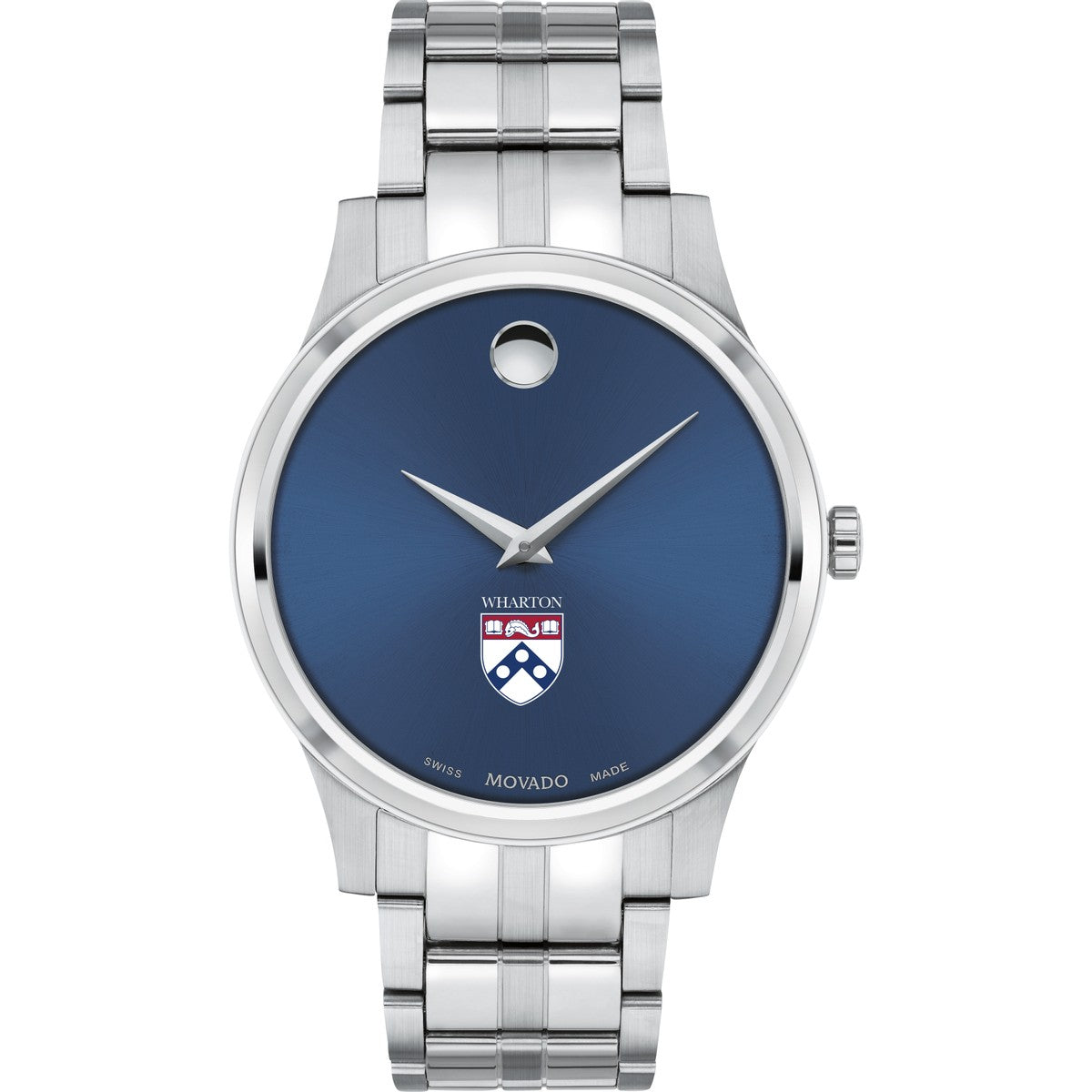 The Wharton Men's Movado Collection watch boasts a striking blue dial featuring the iconic Wharton Logo in full color. This timeless timepiece, renowned for its concave dot representing the sun at high noon, has been a symbol of elegance since its inception in 1947. Make it uniquely yours with free engraving without affecting order processing time.