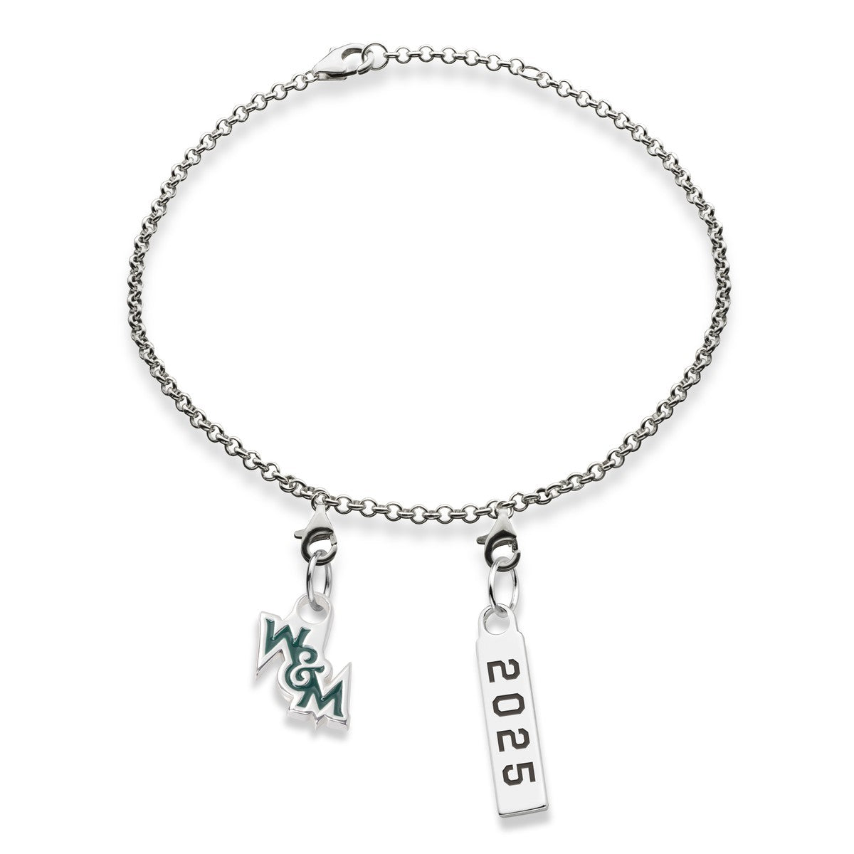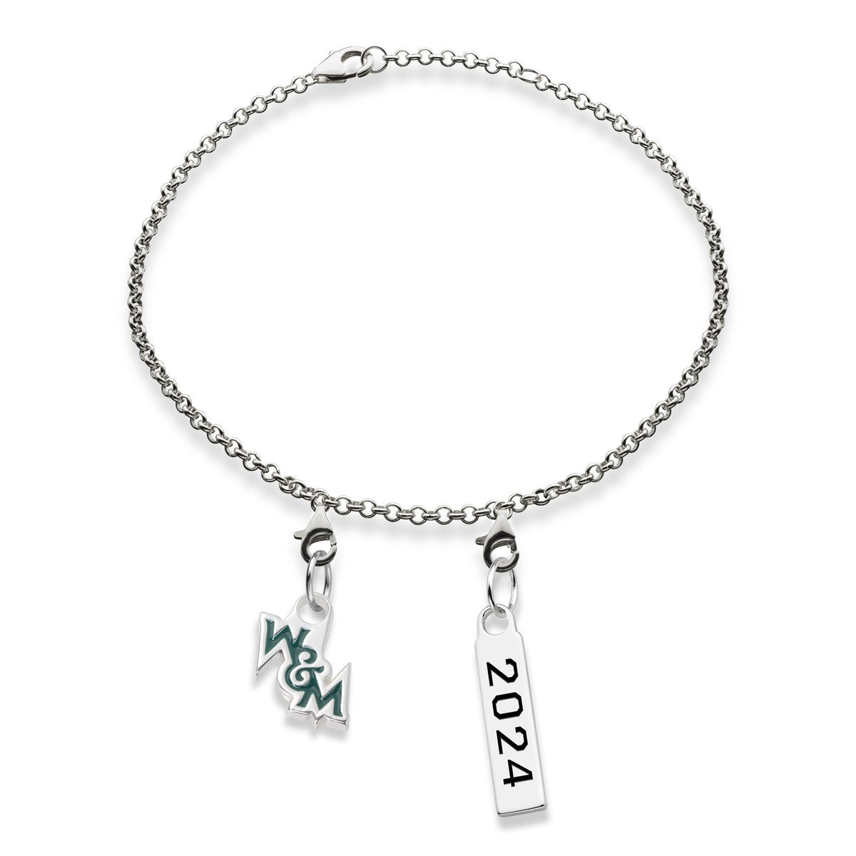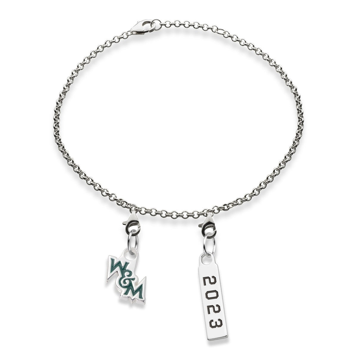 Our spirited College of William & Mary sterling silver anklet is the perfect way to show your school pride. This eye-catching anklet is adorned with two sterling silver charms, one featuring the school logo in colored enamel, the other with the graduation year.