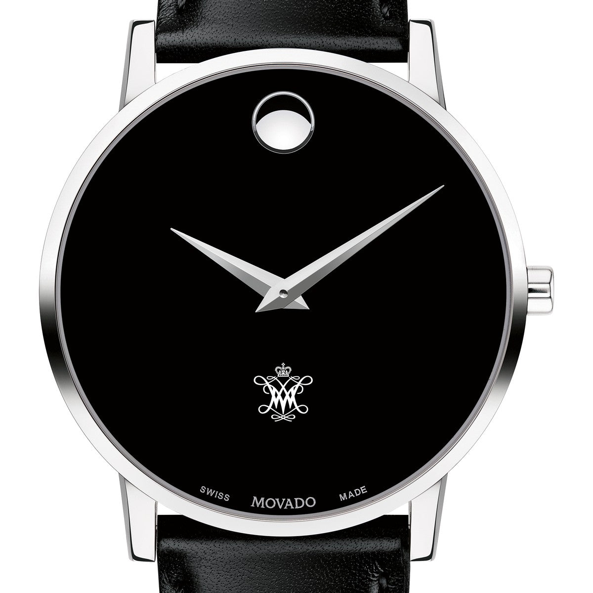 College of William & Mary Men's Movado Museum watch features the William & Mary Logo in full color at 6 o'clock on black dial. Created in 1947, the iconic concave dot symbolizes the sun at high-noon. Complimentary personal engraving.