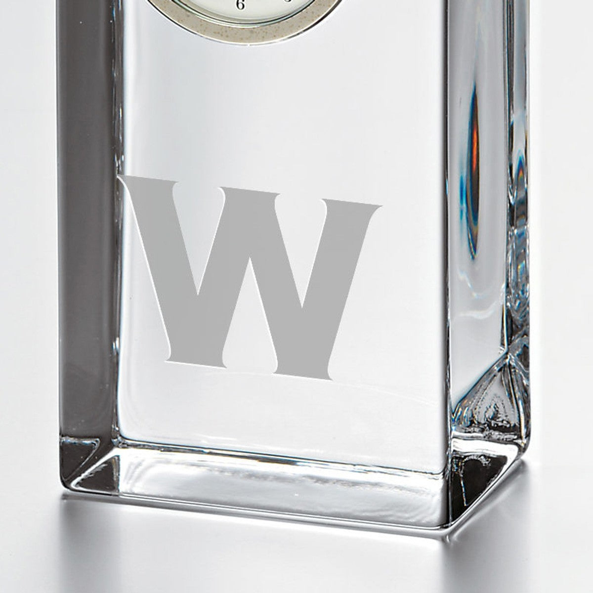 The Williams Tall Glass Desk Clock stands proudly on any surface, distinctly etched with the Williams Logo. The clock showcases a traditional numbered face with a sweep hand to count the seconds.