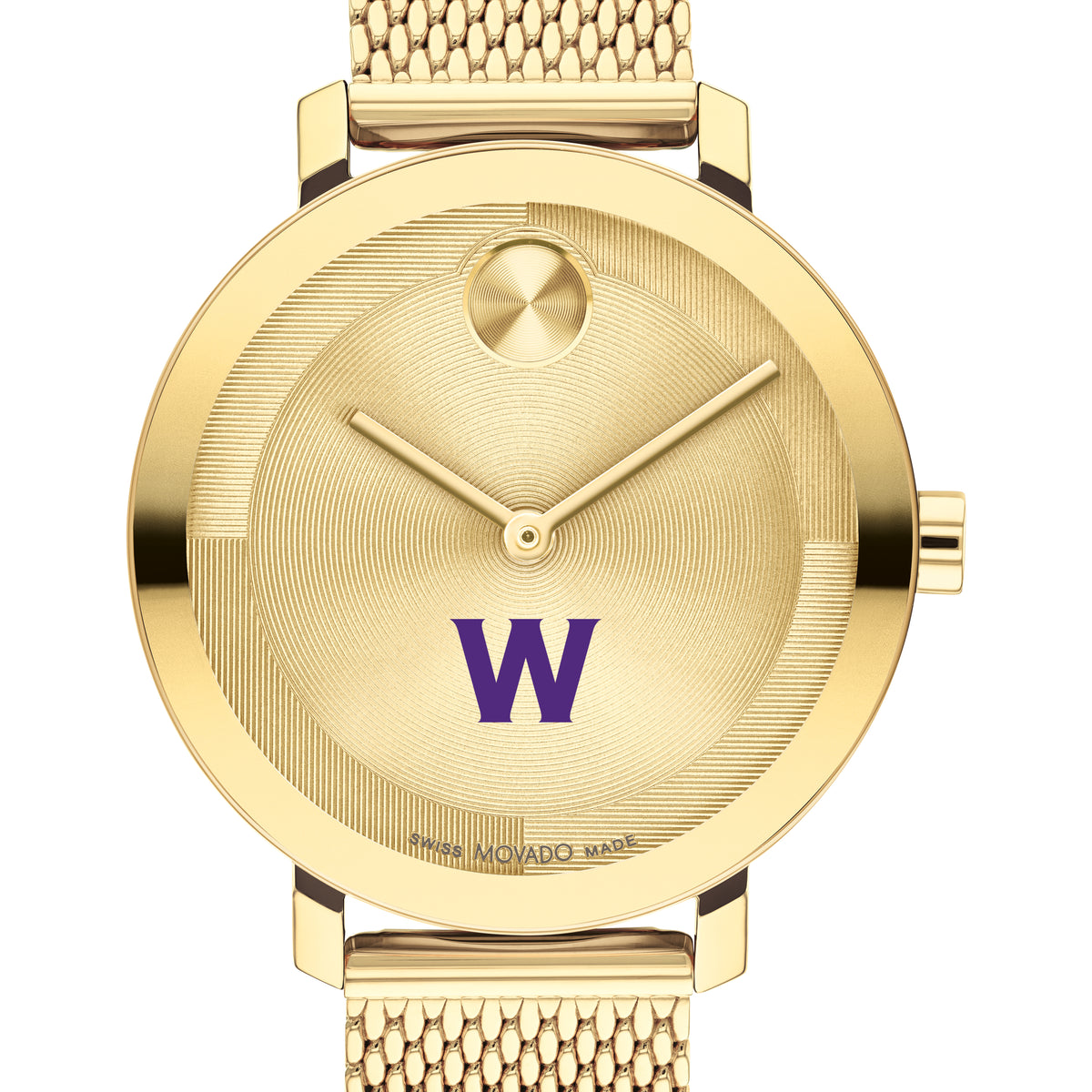 The Williams College Women's BOLD Movado features the prestigious Williams Logo. Its pale gold Ionic-plated stainless steel mesh bracelet exudes contemporary elegance, making it a timeless accessory for the modern woman.