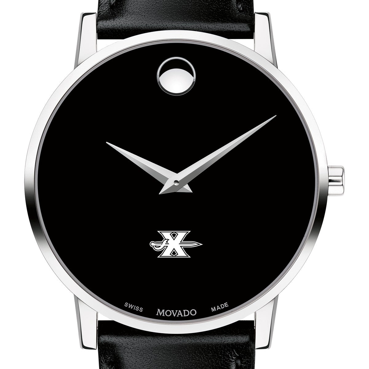 Xavier University Men's Movado Museum watch features the Xavier Logo in full color at 6 o'clock on black dial. Created in 1947, the iconic concave dot symbolizes the sun at high-noon. Complimentary personal engraving.