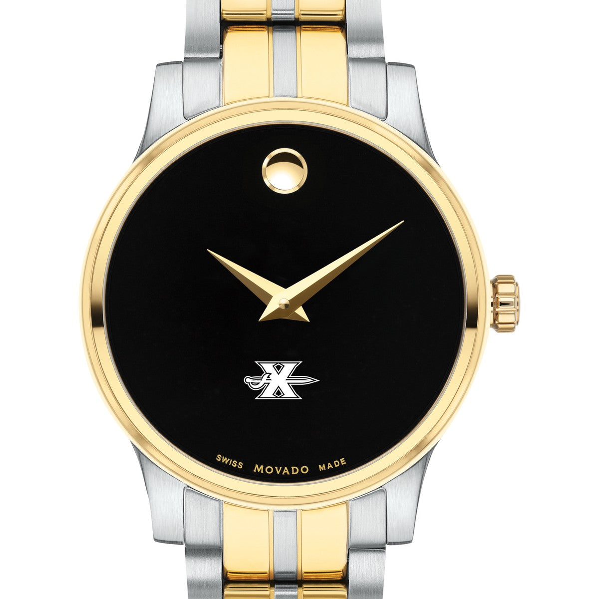 The Xavier University Women's Movado Collection watch showcases the iconic Xavier Logo in full color against a sophisticated black dial. This elegant timepiece, featuring the renowned concave dot symbolizing the sun at high noon, embodies timeless style. Personalize your watch with free engraving without any delay to your order.