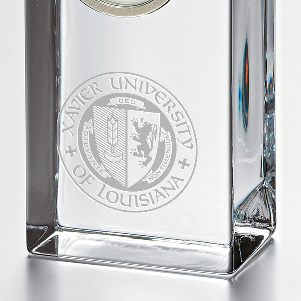 The XULA Tall Glass Desk Clock stands proudly on any surface, distinctly etched with the XULA Logo. The clock showcases a traditional numbered face with a sweep hand to count the seconds.