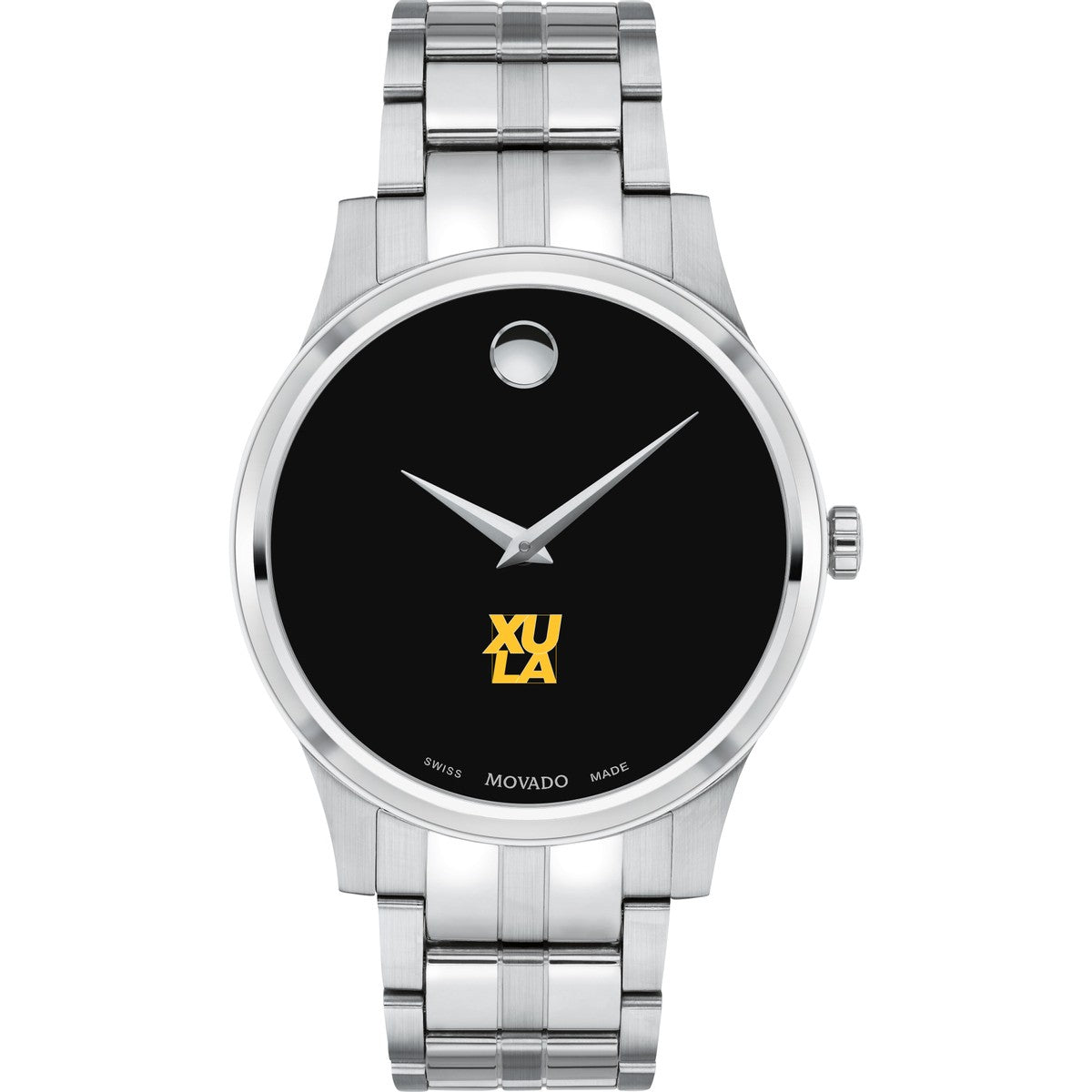 The Xavier University of Louisiana Men's Movado Collection watch showcases the iconic XULA Logo in full color on a sophisticated black dial. This classic timepiece, featuring the renowned concave dot symbolizing the sun at high noon, has been a design masterpiece since its creation in 1947. Personalize your watch with free engraving without any delay to your order.