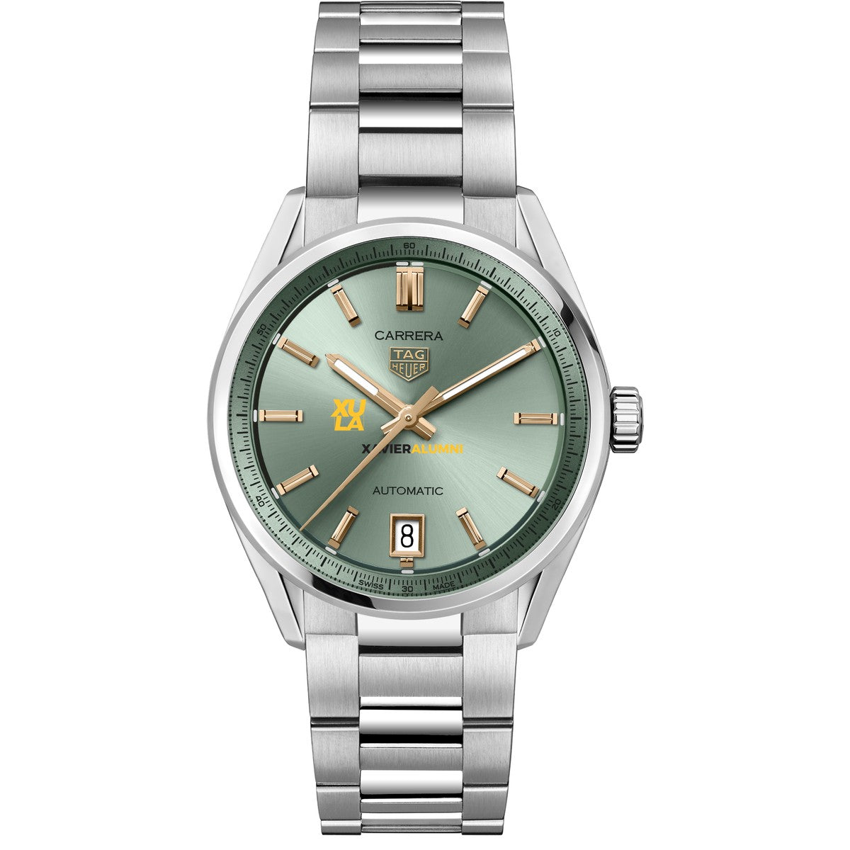 Explore the XULA Women's TAG Heuer Steel Carrera watch, featuring the XULA Logo on a pastel green sunray brushed dial with 18K 5N rose gold-plated hands and indexes. Equipped with the Calibre 7 movement, it combines style and superior functionality. Complimentary personal engraving.