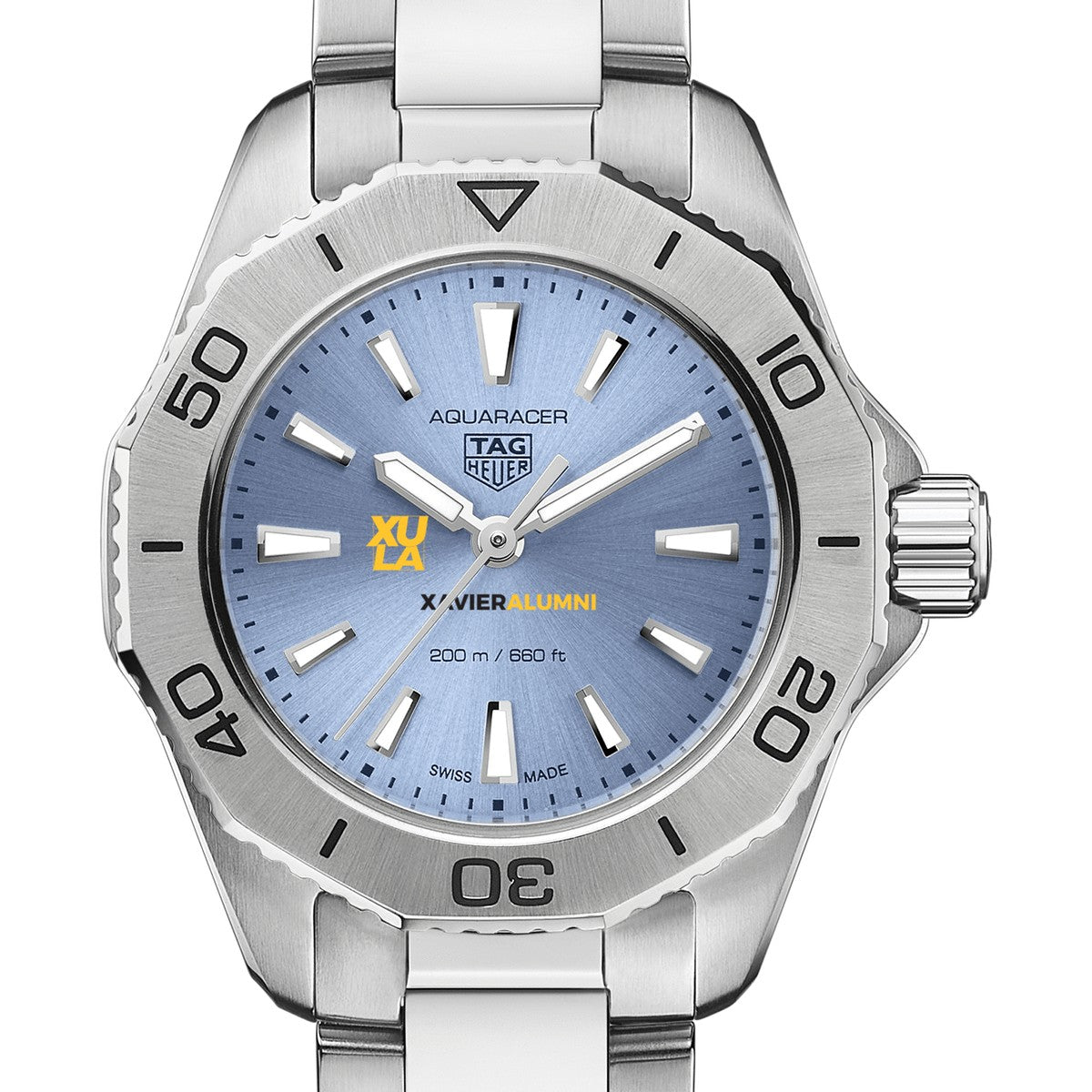 The Xavier University of Louisiana Women's TAG Heuer Steel Aquaracer with Blue Sunray Dial features the XULA Logo on a stunning light blue sunray brushed dial. Complimentary personal engraving.