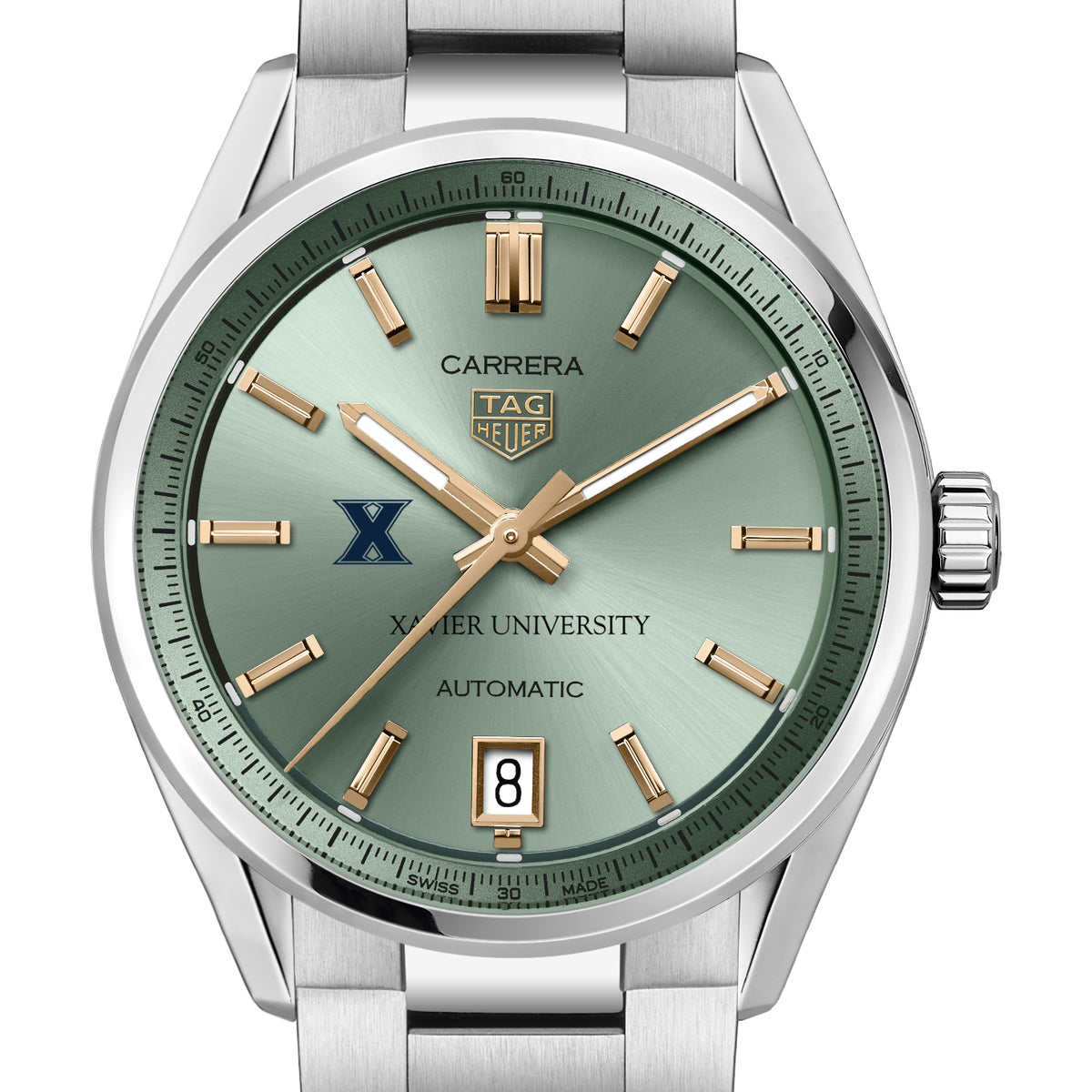Explore the Xavier Women's TAG Heuer Steel Carrera watch, featuring the Xavier Logo on a pastel green sunray brushed dial with 18K 5N rose gold-plated hands and indexes. Equipped with the Calibre 7 movement, it combines style and superior functionality. Complimentary personal engraving.