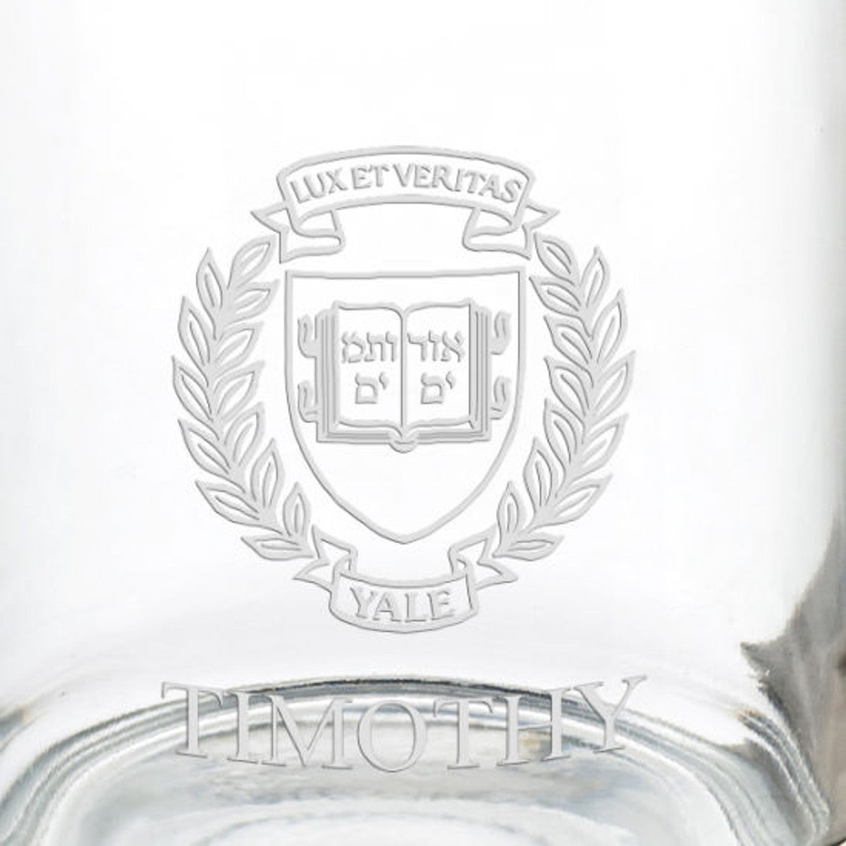 The Yale glass coffee mug is deep-etched with the Yale University logo. Generously proportioned 13 oz glasses are a pleasure to hold. Your name can be added under the logo for free.