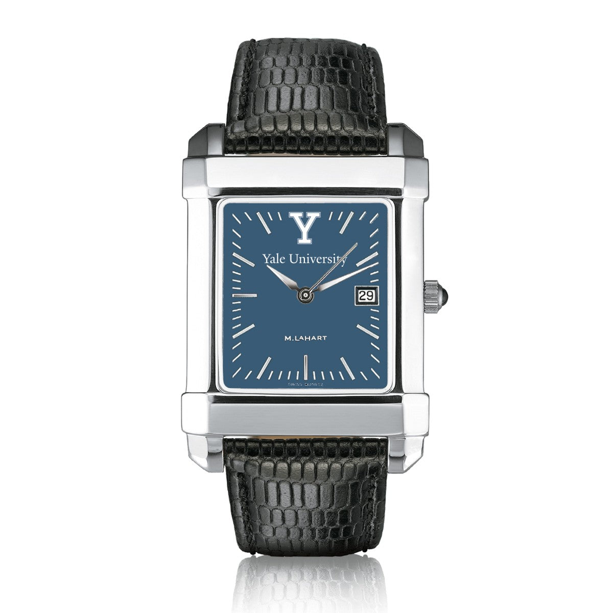 Yale University men's steel watch featuring Yale crest at 12 o'clock and "Yale University" inscribed below on blue dial.