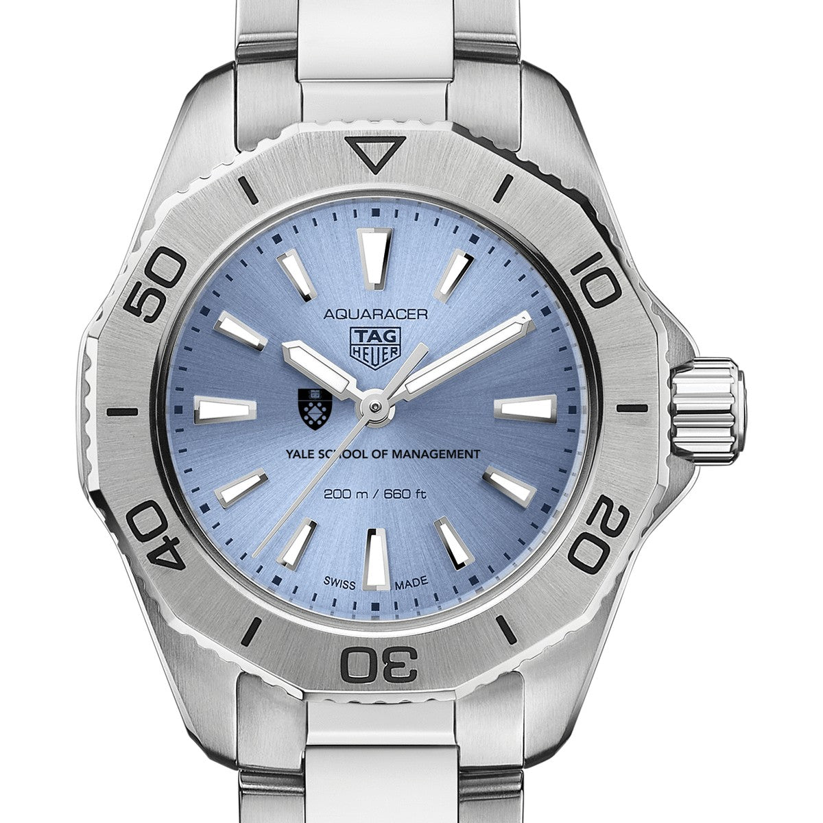 The Yale School of Management Women's TAG Heuer Steel Aquaracer with Blue Sunray Dial features the Yale SOM Logo on a stunning light blue sunray brushed dial. Complimentary personal engraving.