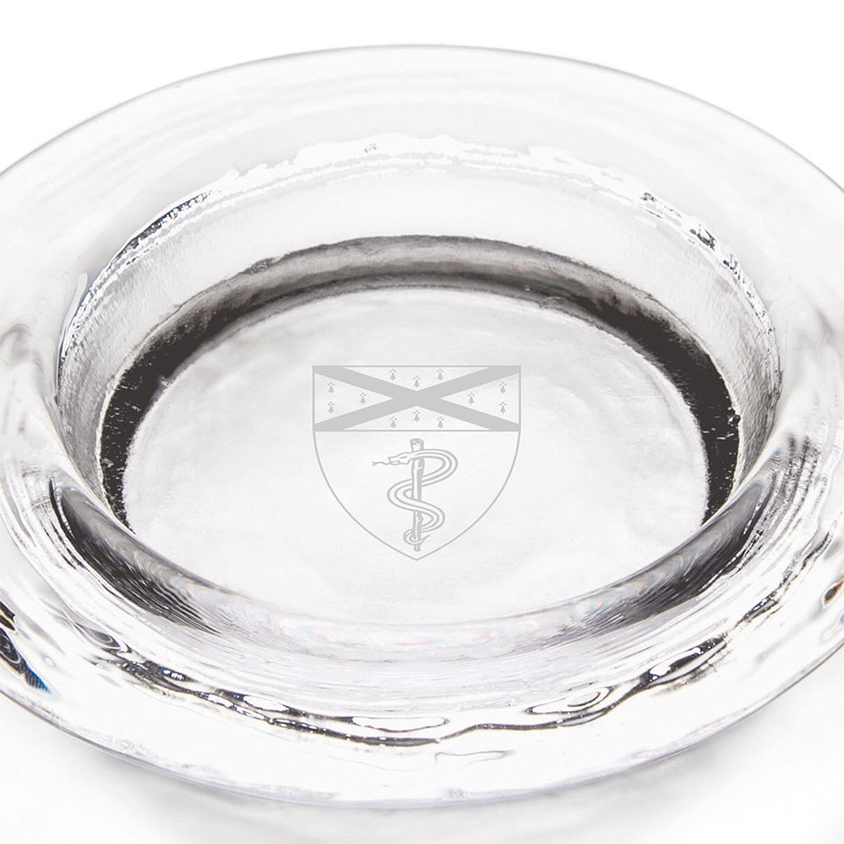 The Yale School of Medicine Glass Wine Coaster, with the Yale School of Medicine logo distinctly etched on the base, is handcrafted with a thick, round lip and ample opening to accommodate different bottle sizes. Not only is the wine coaster an elegant feature to any table, it will also protect your furniture's finish.