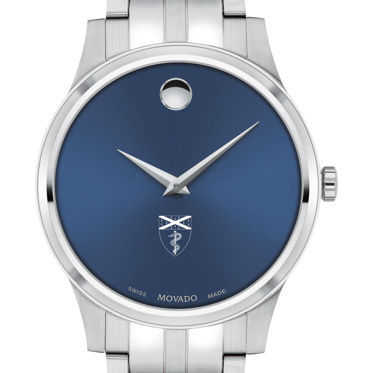 The Yale School of Medicine Men's Movado Collection watch boasts a striking blue dial featuring the iconic Yale School of Medicine logo in full color. This timeless timepiece, renowned for its concave dot representing the sun at high noon, has been a symbol of elegance since its inception in 1947. Make it uniquely yours with free engraving without affecting order processing time.