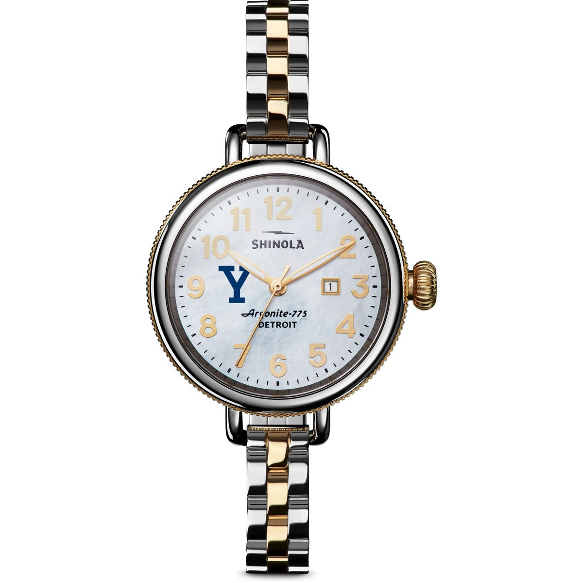 Hand-built from the finest components, the Yale University Birdy features a mother-of-pearl dial in a stainless steel case with a classic coin edge detail. A two-tone bracelet completes the look. Dainty and delicate, sharp and strong, this watch is proof pretty little things can make pretty big statements. Complimentary personal engraving