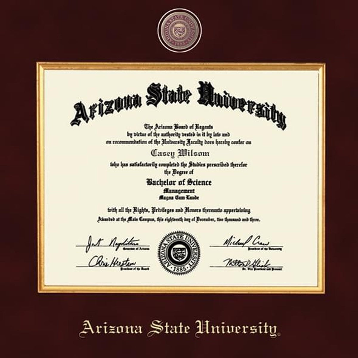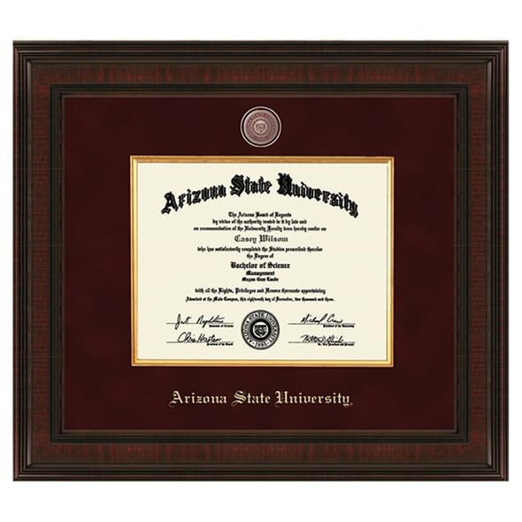- Frame fits Arizona State (Bachelors & Masters) diploma measuring 8.5x11 H. Overall frame dimensions are 17.75x19.75