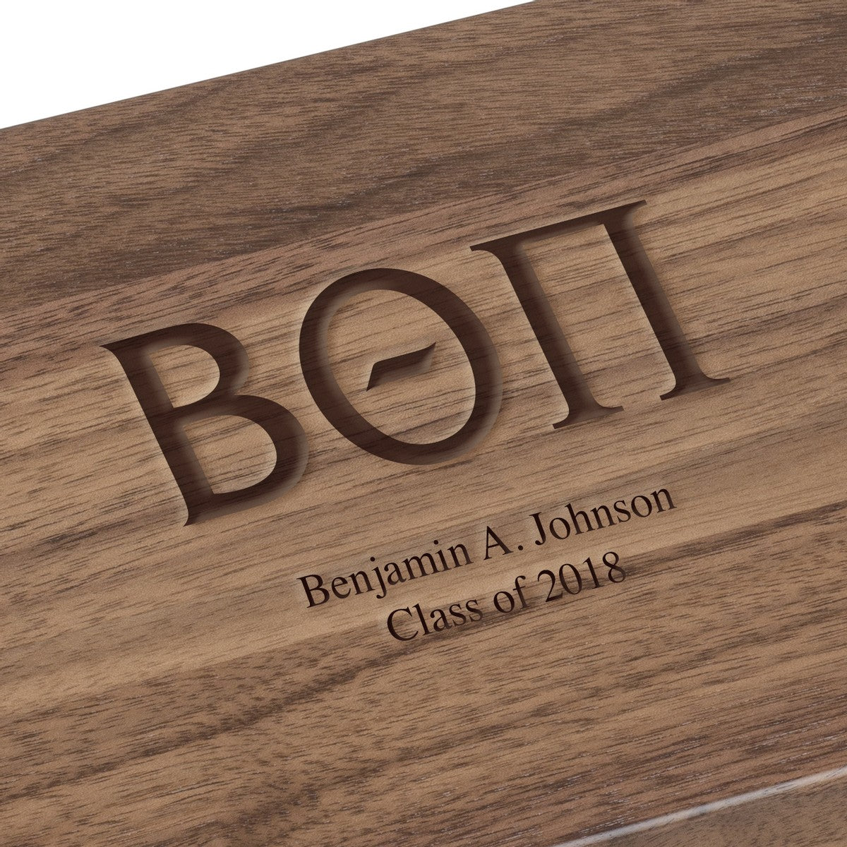 Our beautiful solid walnut desk box is made from hand-selected domestic walnut and crafted in the USA. Each box is hand finished with care, and proudly displays the Beta Theta Pi Logo on the lid.