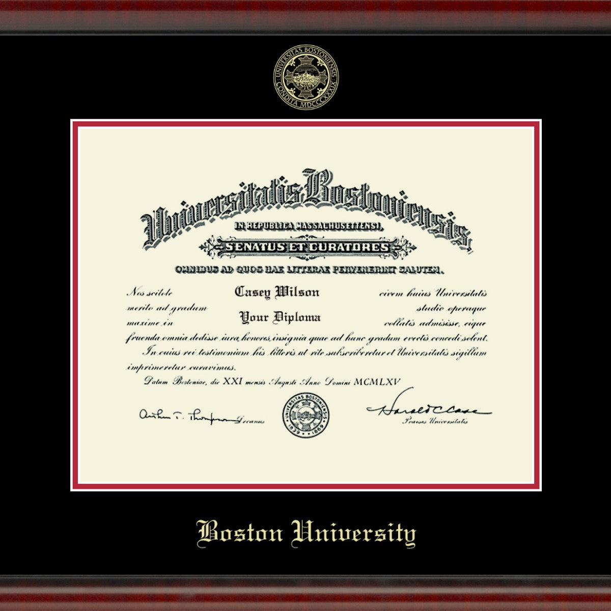 This Boston University diploma frame is crafted from solid wood in the USA. Proudly display your BU diploma with museum quality conservation mounting materials to showcase and protect your Boston University diploma.