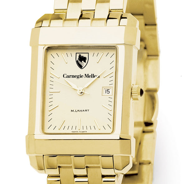 Carnegie Mellon University men's gold watch featuring the Carnegie Mellon logo on cream dial. Free Engraving on all watches.
