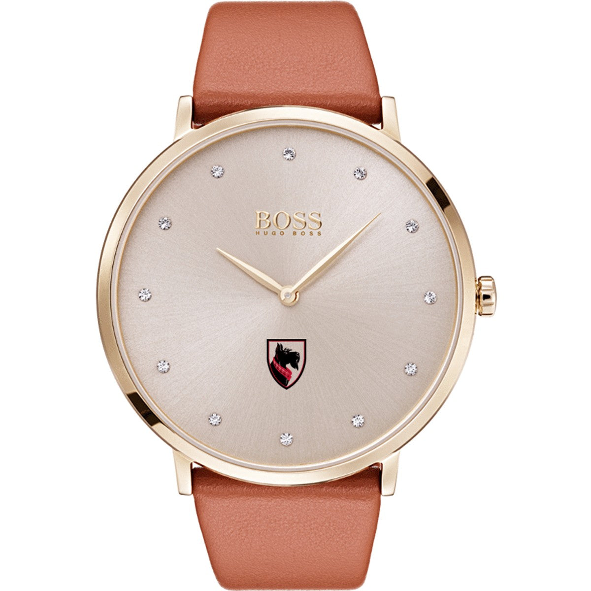 The Carnegie Mellon University Hugo Boss women's gold finish watch features an elegant, minimalistic look that is enhanced by the on the sleek champagne dial. Complimentary personal engraving.