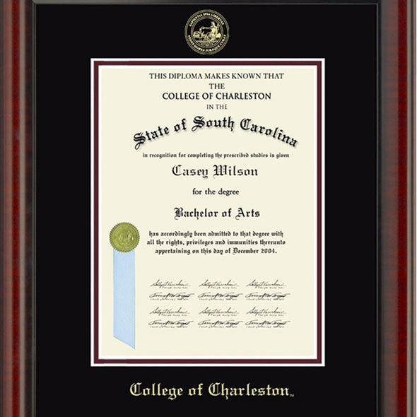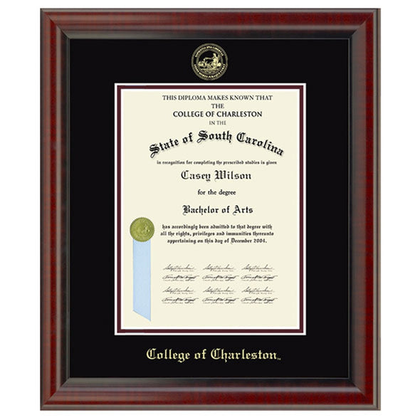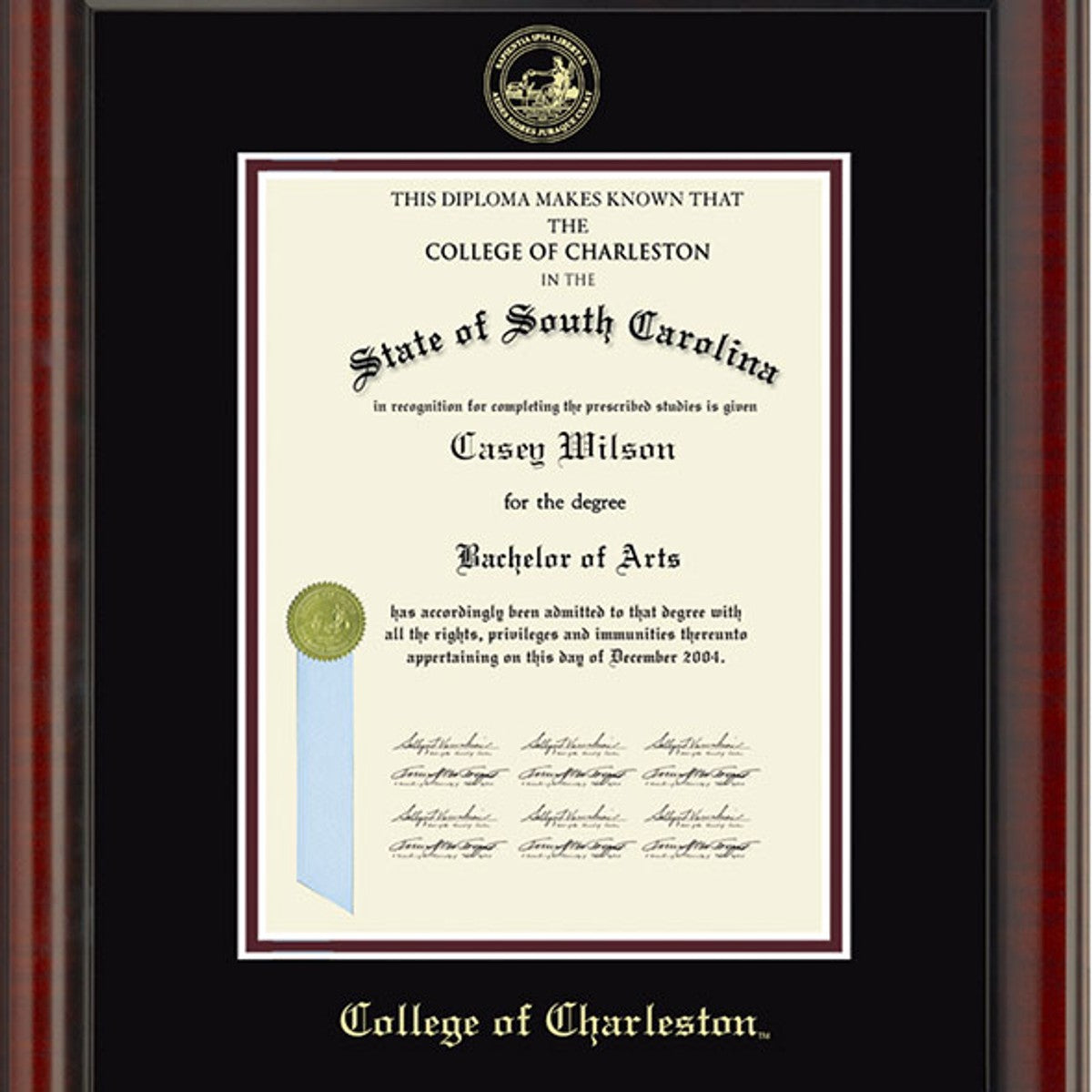 This College of Charleston diploma frame is crafted from solid wood in the USA. Proudly display your Charleston diploma with museum quality conservation mounting materials to showcase and protect your College of Charleston diploma.