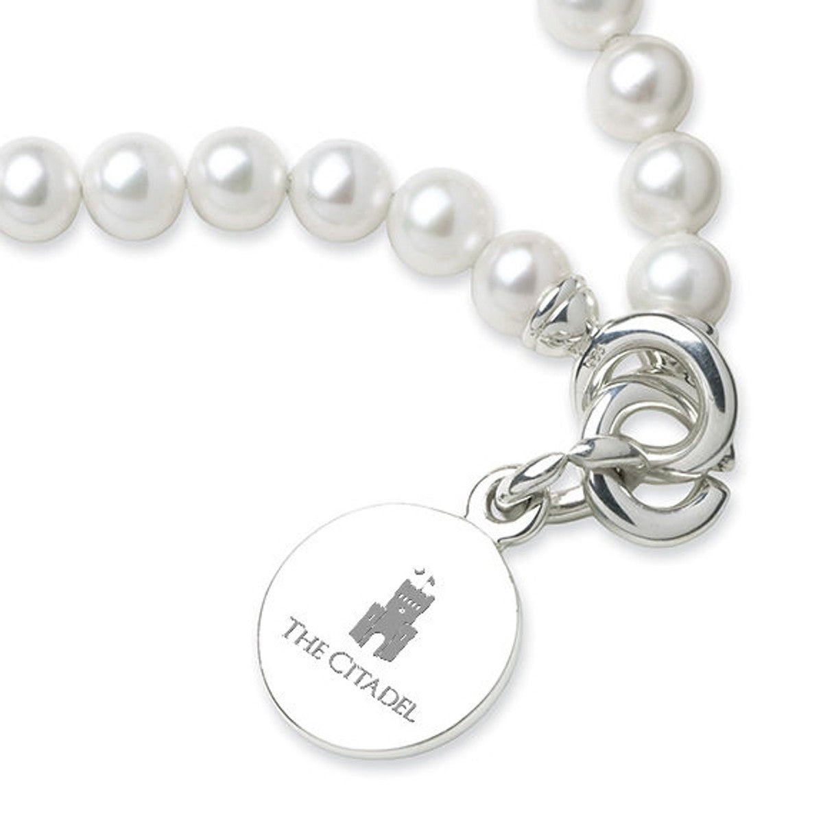 The Citadel pearl bracelet and sterling silver Citadel charm features Citadel seal delicately engraved on front and interlocking "C" clasp.