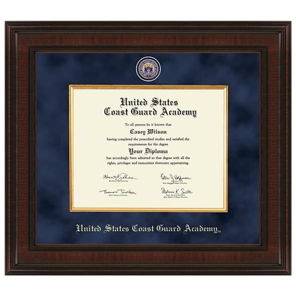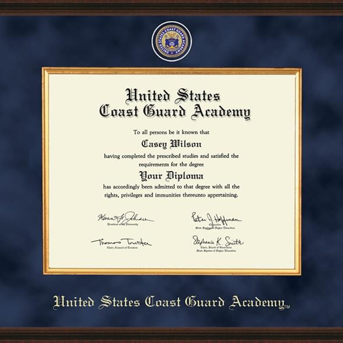 This US Coast Guard Academy diploma frame is specifically made to showcase and preserve your US Coast Guard Academy Diploma. Made from solid wood in the USA to meet stringent Library of Congress standards for archival document preservation.