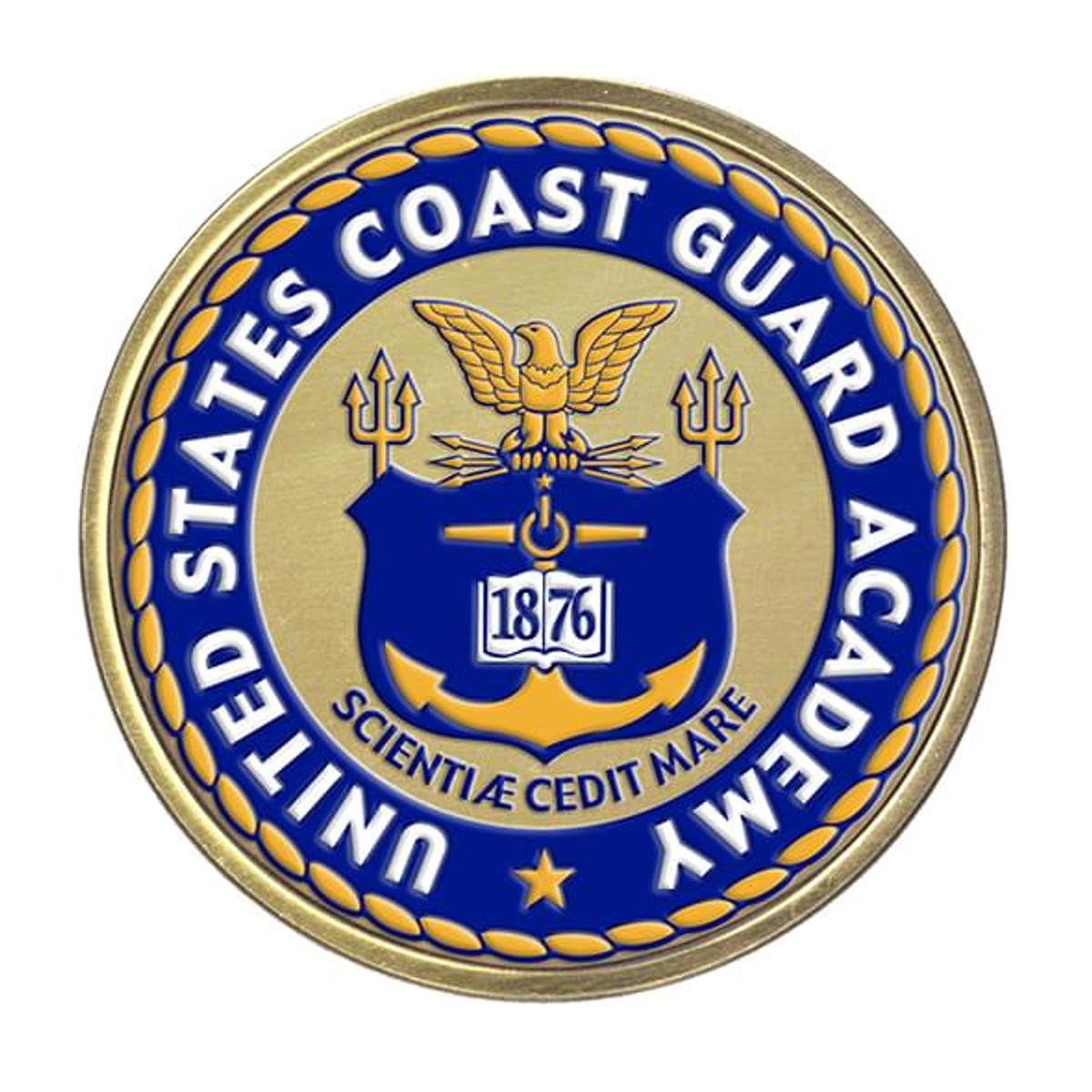 - Custom minted Coast Guard Academy seal with hand painted enamel accents; inset into bevel-cut opening