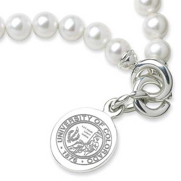 University of Colorado pearl bracelet and sterling silver Colorado charm features the Colorado logo delicately engraved on front and interlocking "C" clasp.