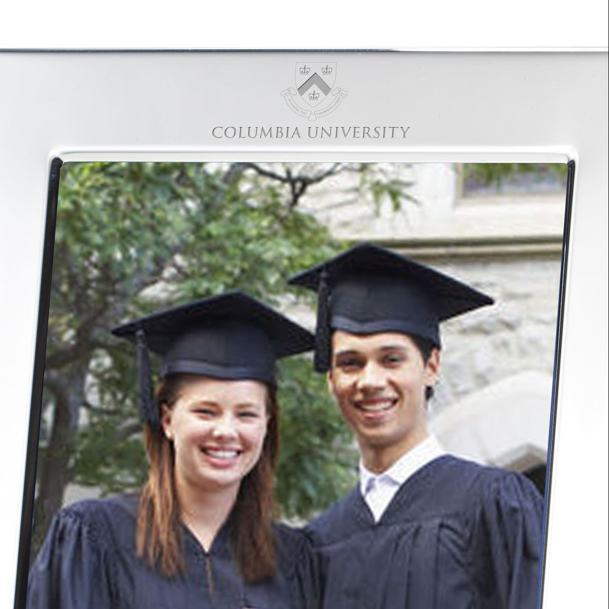 The frame features an intricately engraved Columbia insignia and name, positioned at the top of the frame. Up to 2 lines of personalization can be added below with the option of landscape or portrait orientation.