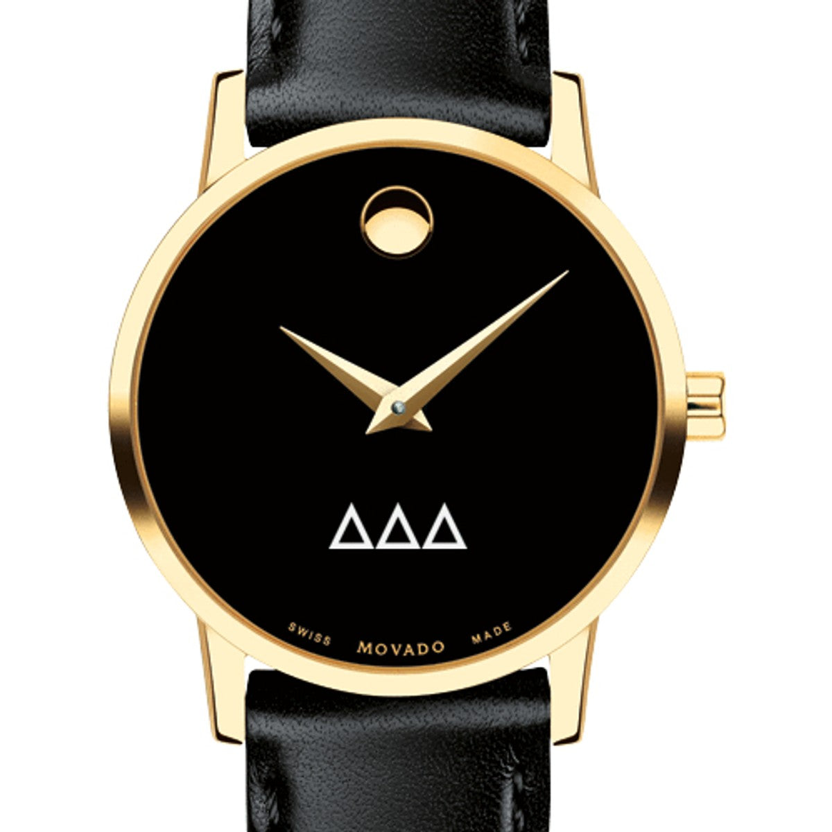 Delta Delta Delta Women's Movado Museum watch features the Delta Delta Delta logo in full color at 6 o'clock on black dial. Created in 1947, the iconic concave dot symbolizes the sun at high-noon.