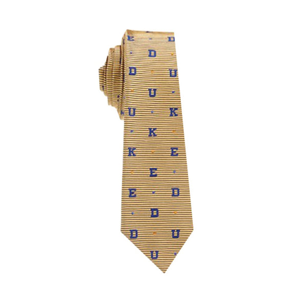 Duke University skinny silk tie features the D-U-K-E repeated on a gold background.