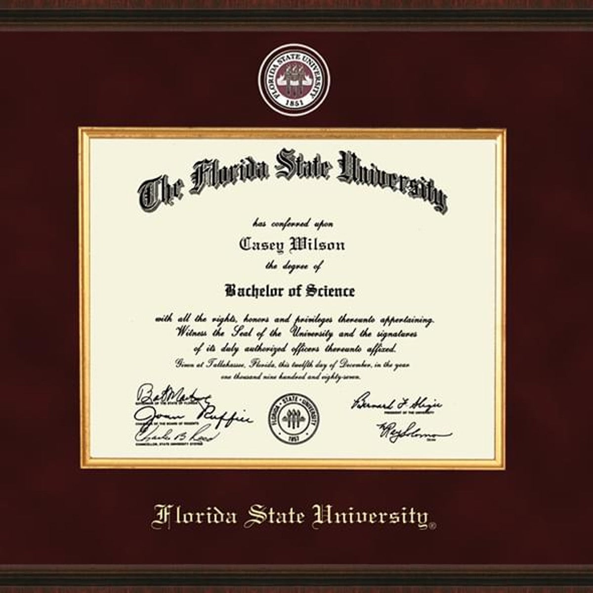 This Florida State University diploma frame is specifically made to showcase and preserve your Florida State University Diploma. Made from solid wood in the USA to meet stringent Library of Congress standards for archival document preservation.
