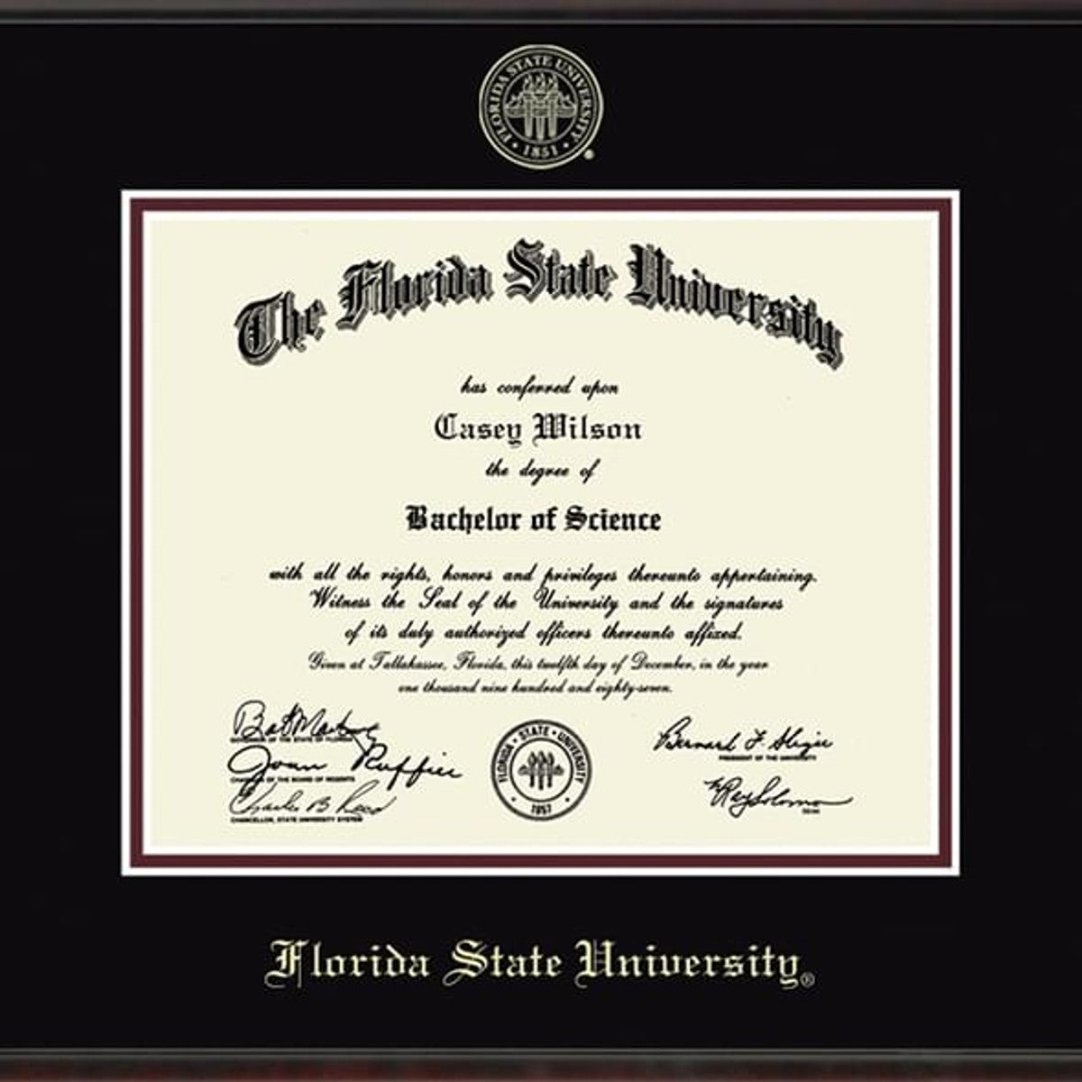 This Florida State University diploma frame is crafted from solid wood in the USA. Proudly display your FSU diploma with museum quality conservation mounting materials to showcase and protect your Florida State University diploma.
