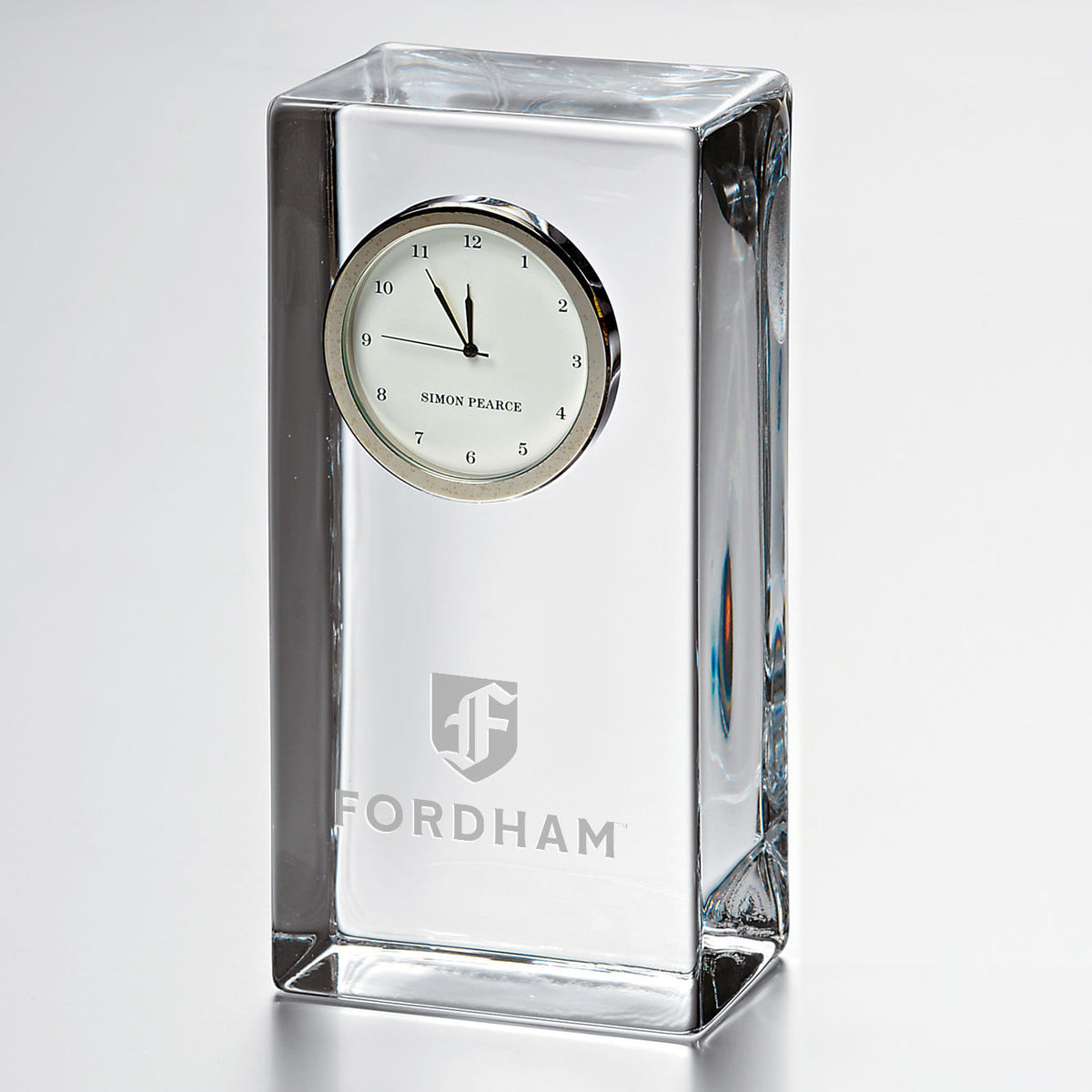 The Fordham Tall Glass Desk Clock stands proudly on any surface, distinctly etched with the Fordham Logo. The clock showcases a traditional numbered face with a sweep hand to count the seconds.