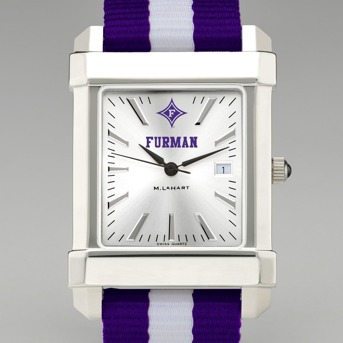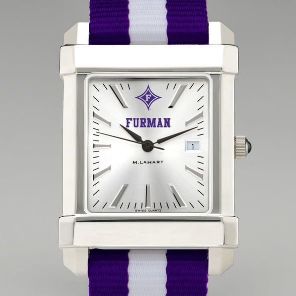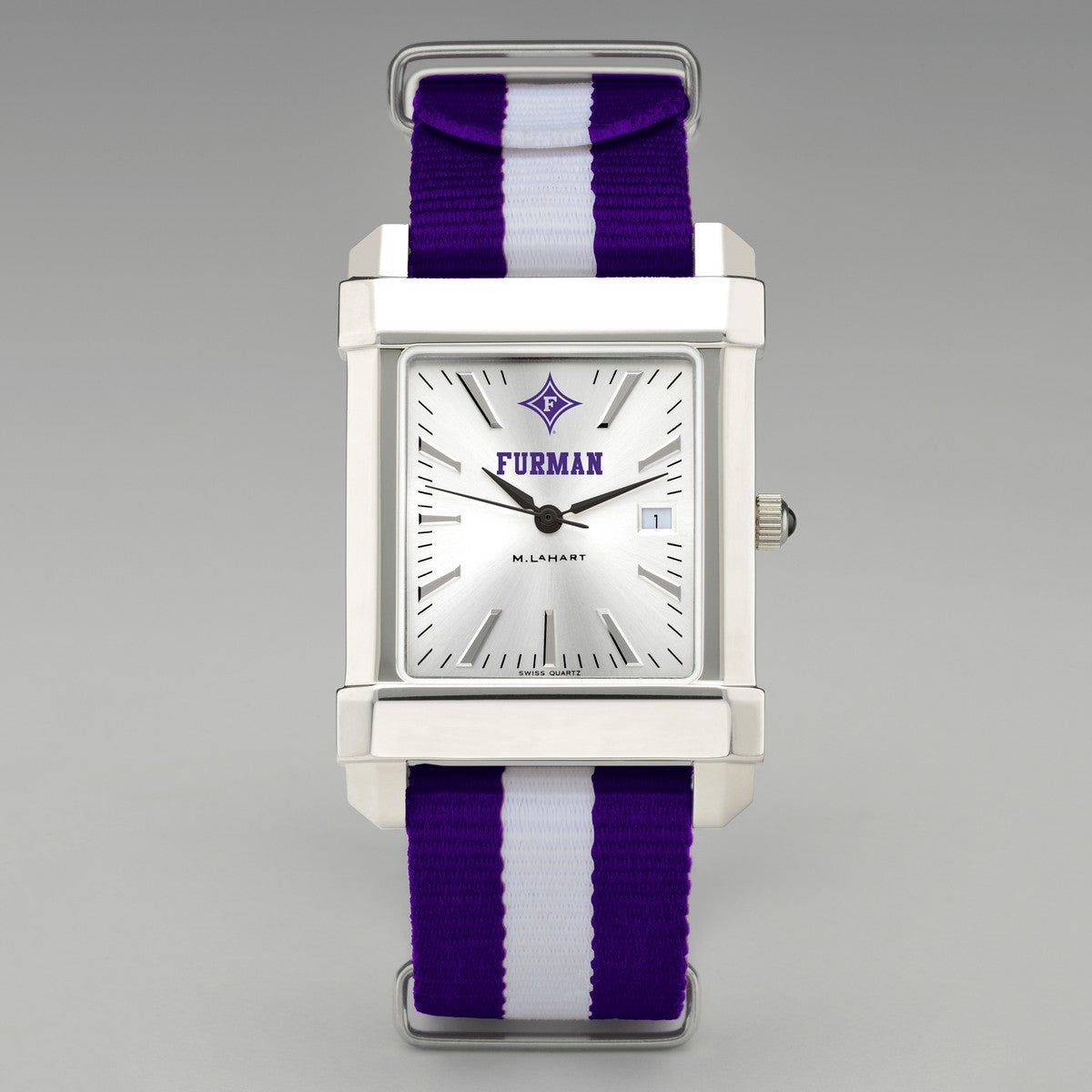This Furman University original features the Furman Logo on our sophisticated new dial with a sunray brushed metallic finish. The RAF Nylon strap popularized by James Bond now features your school colors for the first time. Free personalization available on the back of the watch with initials and graduation year.