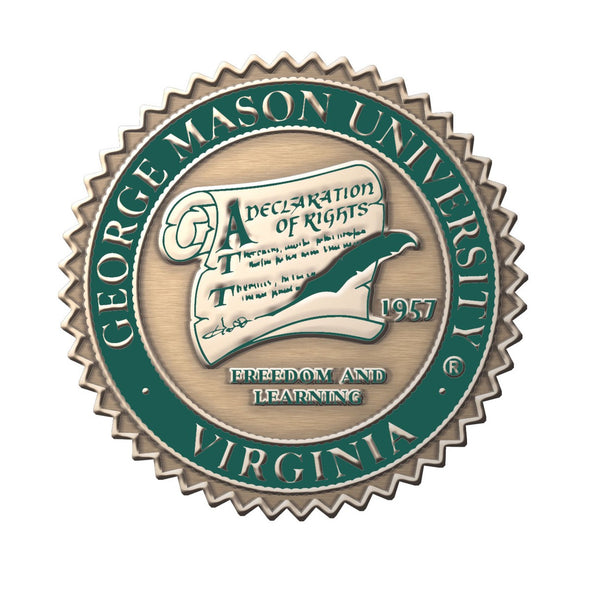 - Custom minted George Mason seal with hand painted enamel accents; inset into bevel-cut opening
