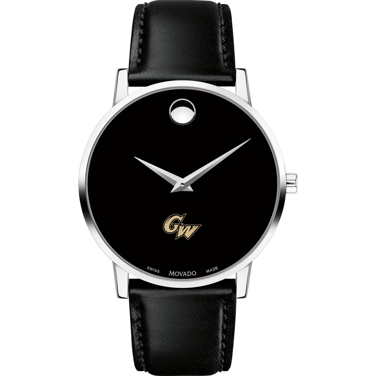George Washington University Men's Movado Museum watch features the George Washington Logo in full color at 6 o'clock on black dial. Created in 1947, the iconic concave dot symbolizes the sun at high-noon. Complimentary personal engraving.