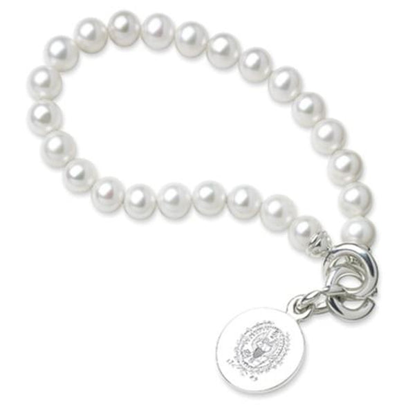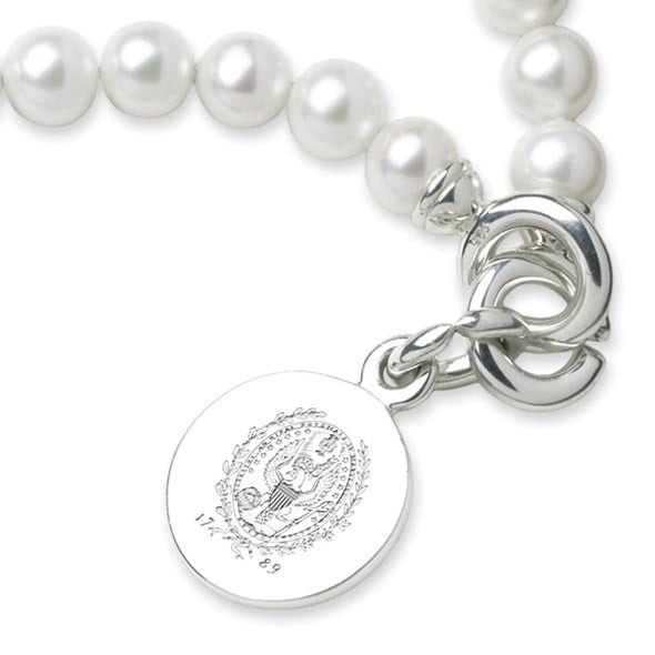 Georgetown University pearl bracelet and sterling silver Georgetown charm features Georgetown crest delicately engraved on front and interlocking "C" clasp.
