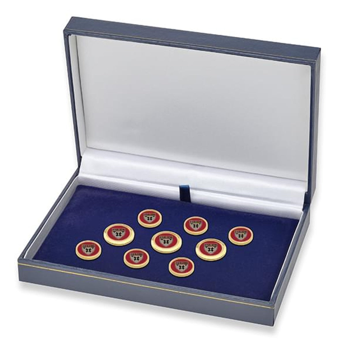 Add some Harvard Business School polish to your blazer with these buttons. Designed in England with traditional enamel and gold finish. Blazer set includes 3 large buttons and 6 small buttons.