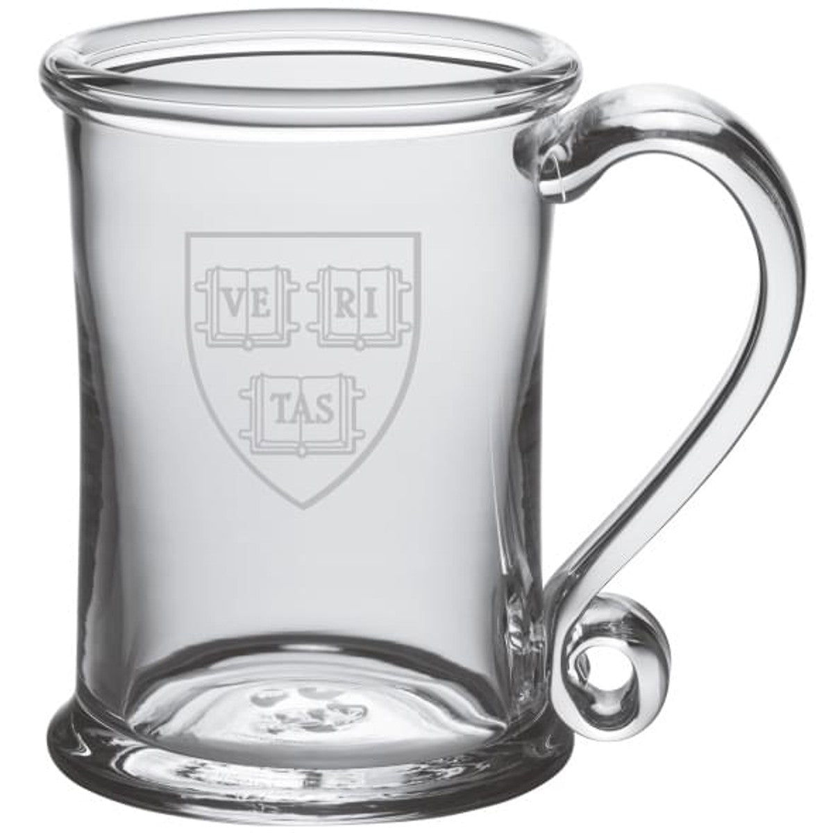 The Harvard Glass Tankard is an ideal choice if you're looking for a versatile glass. The enchantingly curved glass handle will help ensure that you don't spill a drop. The Glass Tankard has the Harvard Logo handsomely etched on the hand-blown glass.