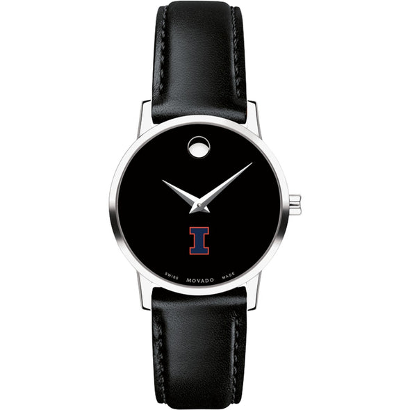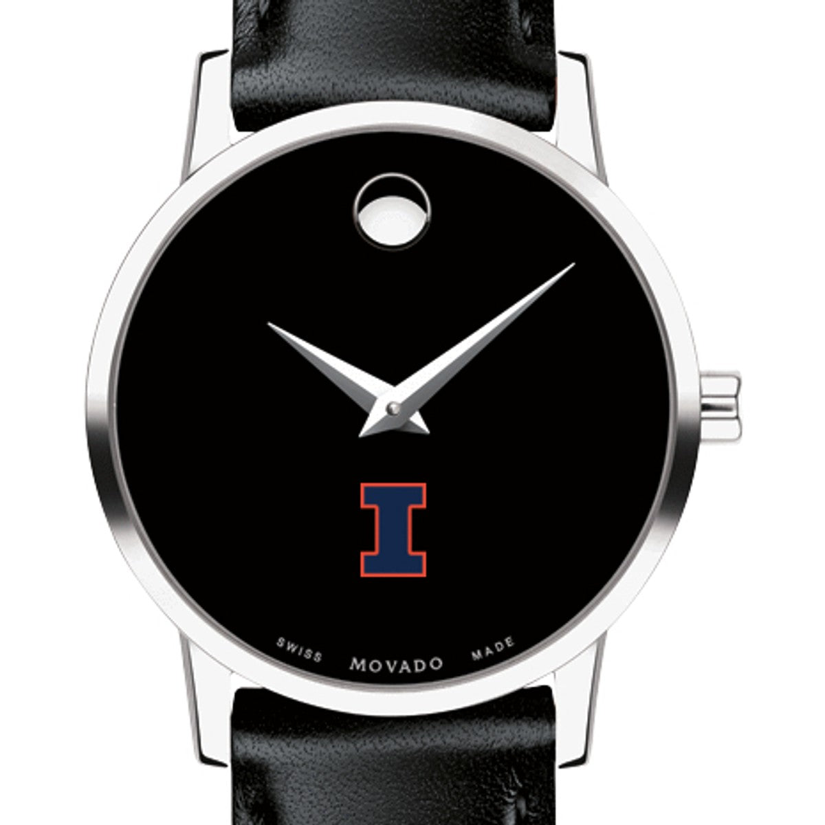 University of Illinois Women's Movado Museum watch features the Illinois Logo in full color at 6 o'clock on black dial. Created in 1947, the iconic concave dot symbolizes the sun at high-noon. Complimentary personal engraving.