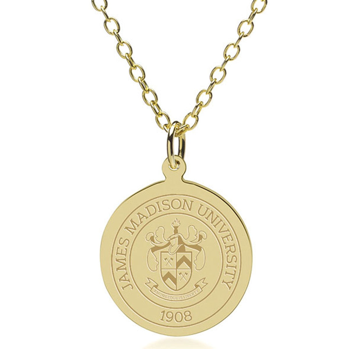 This solid 18-karat gold pendant and chain is an instant heirloom, featuring the James Madison Logo beautifully engraved on the front with room for personalization on the back.