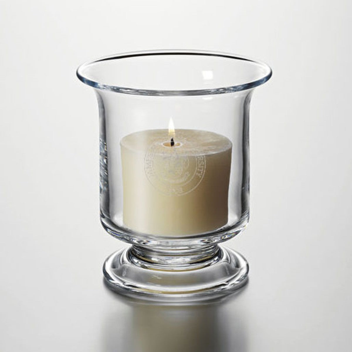 The James Madison Glass Hurricane Candleholder, with the James Madison Logo beautifully engraved on the handcrafted glass, is a great addition to any home. The versatile piece can be used for anything from cradling thick pillars and floating candles to showcasing delicate floral clippings.