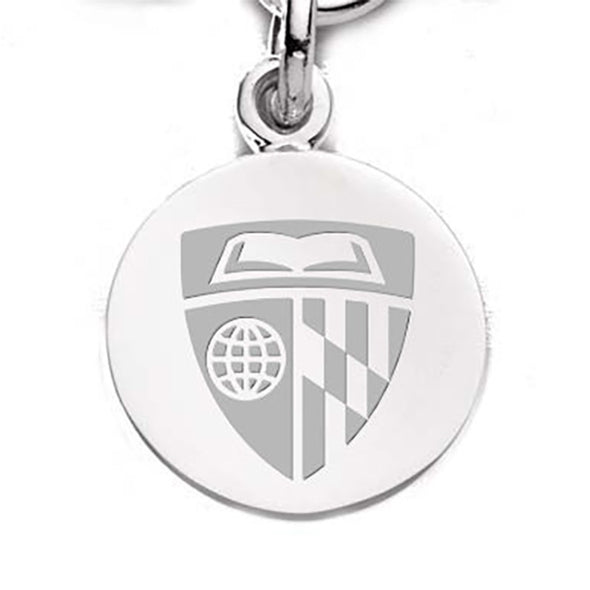 Johns Hopkins University sterling silver, finely detailed charm features Johns Hopkins shield on front.