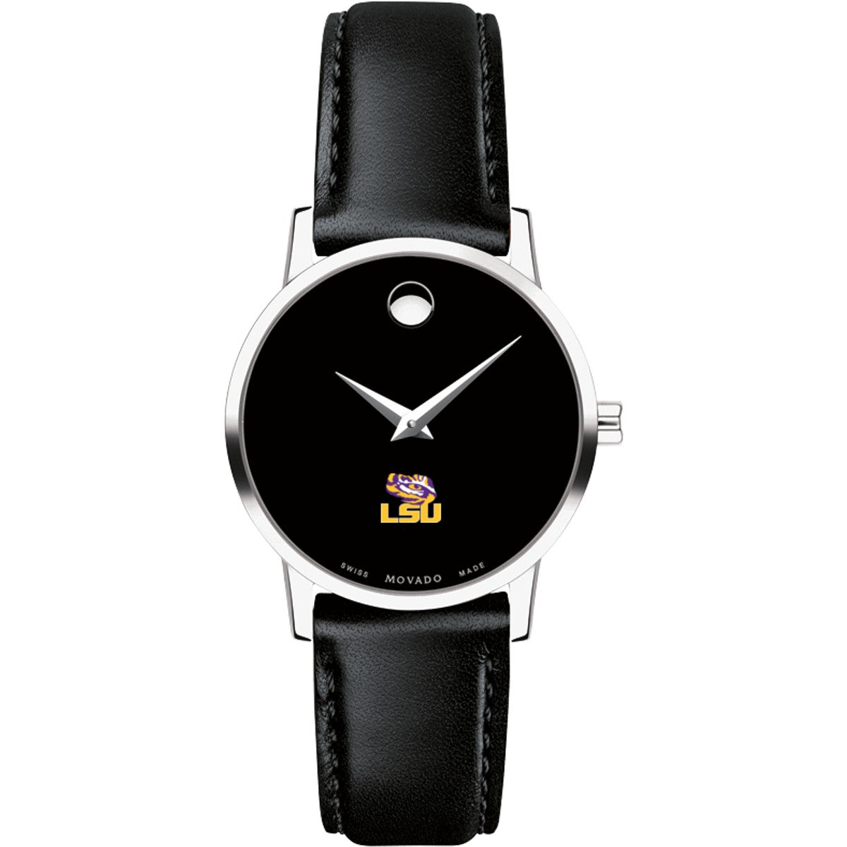 Louisiana State University Women's Movado Museum watch features the LSU Logo in full color at 6 o'clock on black dial. Created in 1947, the iconic concave dot symbolizes the sun at high-noon. Complimentary personal engraving.