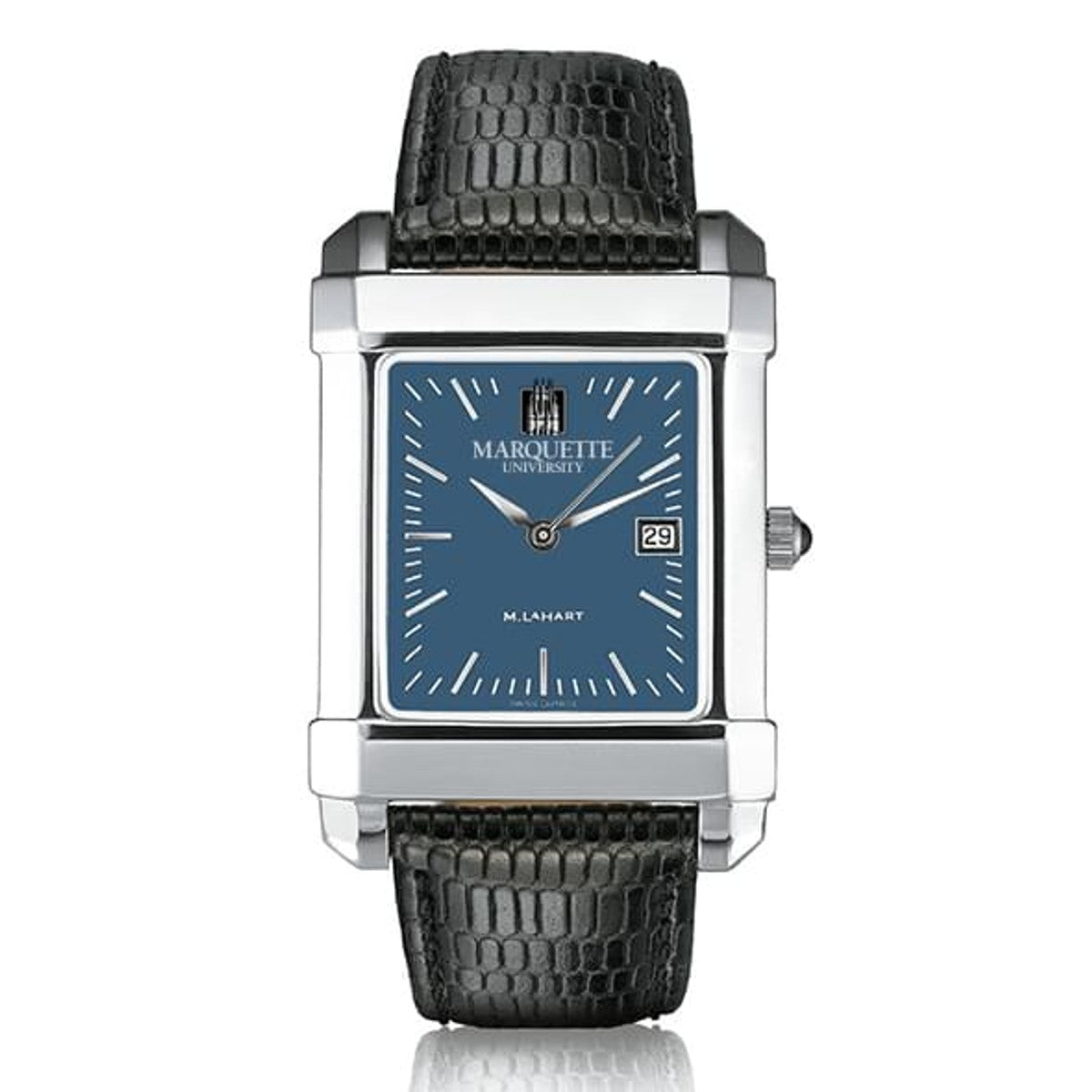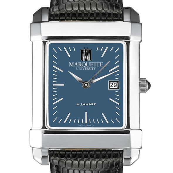 Marquette University men's steel watch featuring Marquette seal at 12 o'clock and "Marquette University" inscribed below on blue dial.