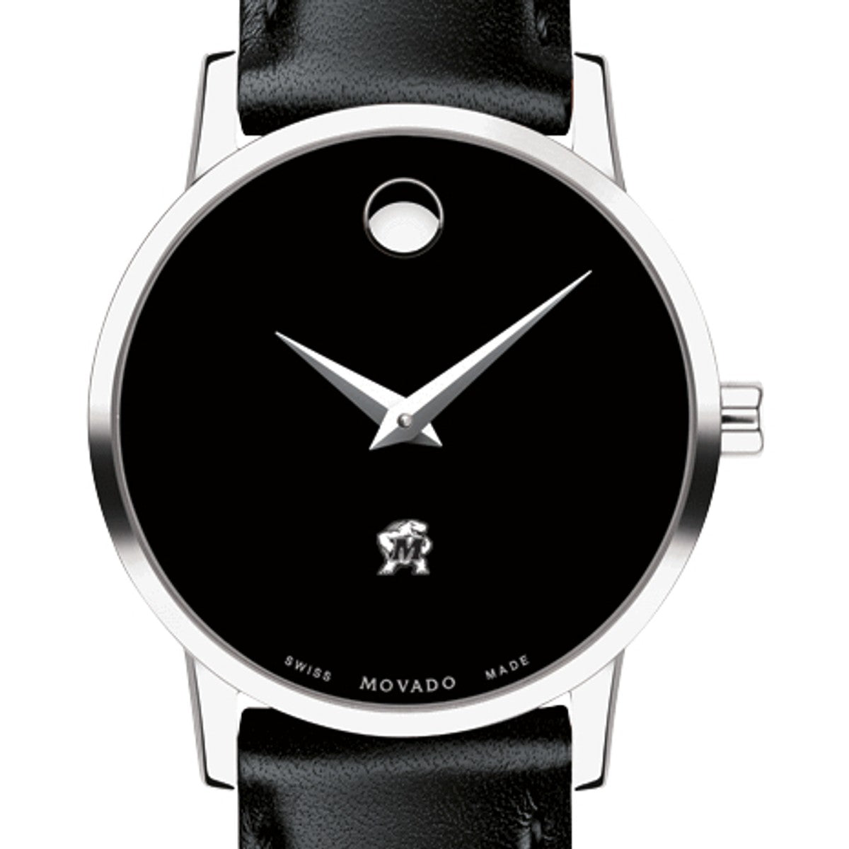 University of Maryland Women's Movado Museum watch features the Maryland Logo in full color at 6 o'clock on black dial. Created in 1947, the iconic concave dot symbolizes the sun at high-noon. Complimentary personal engraving.