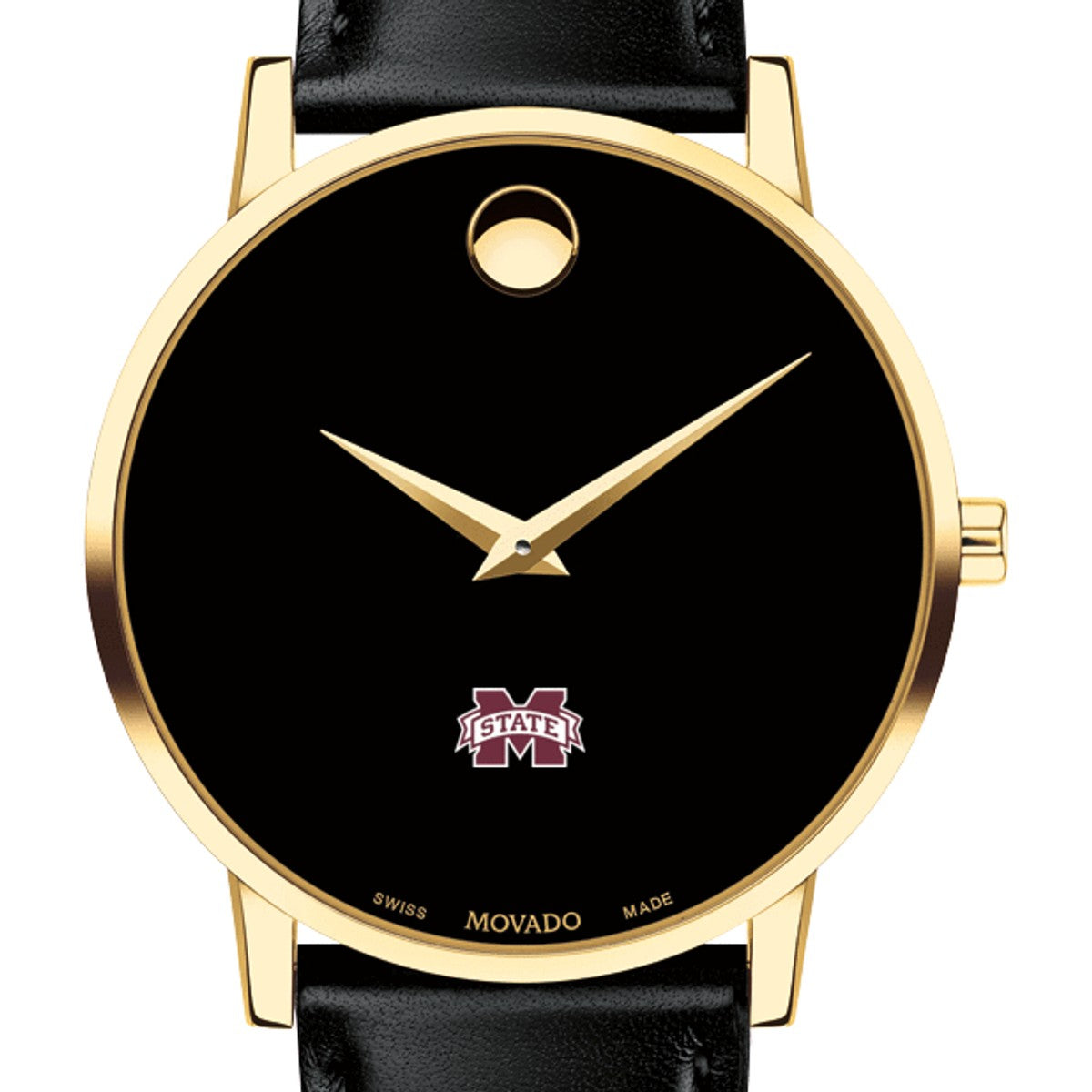 Mississippi State Men's Movado Museum watch features the MS State Logo in full color at 6 o'clock on black dial. Created in 1947, the iconic concave dot symbolizes the sun at high-noon. Complimentary personal engraving.