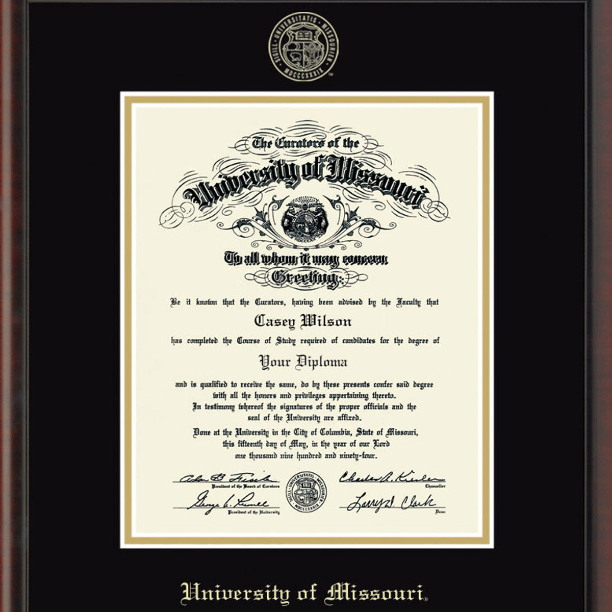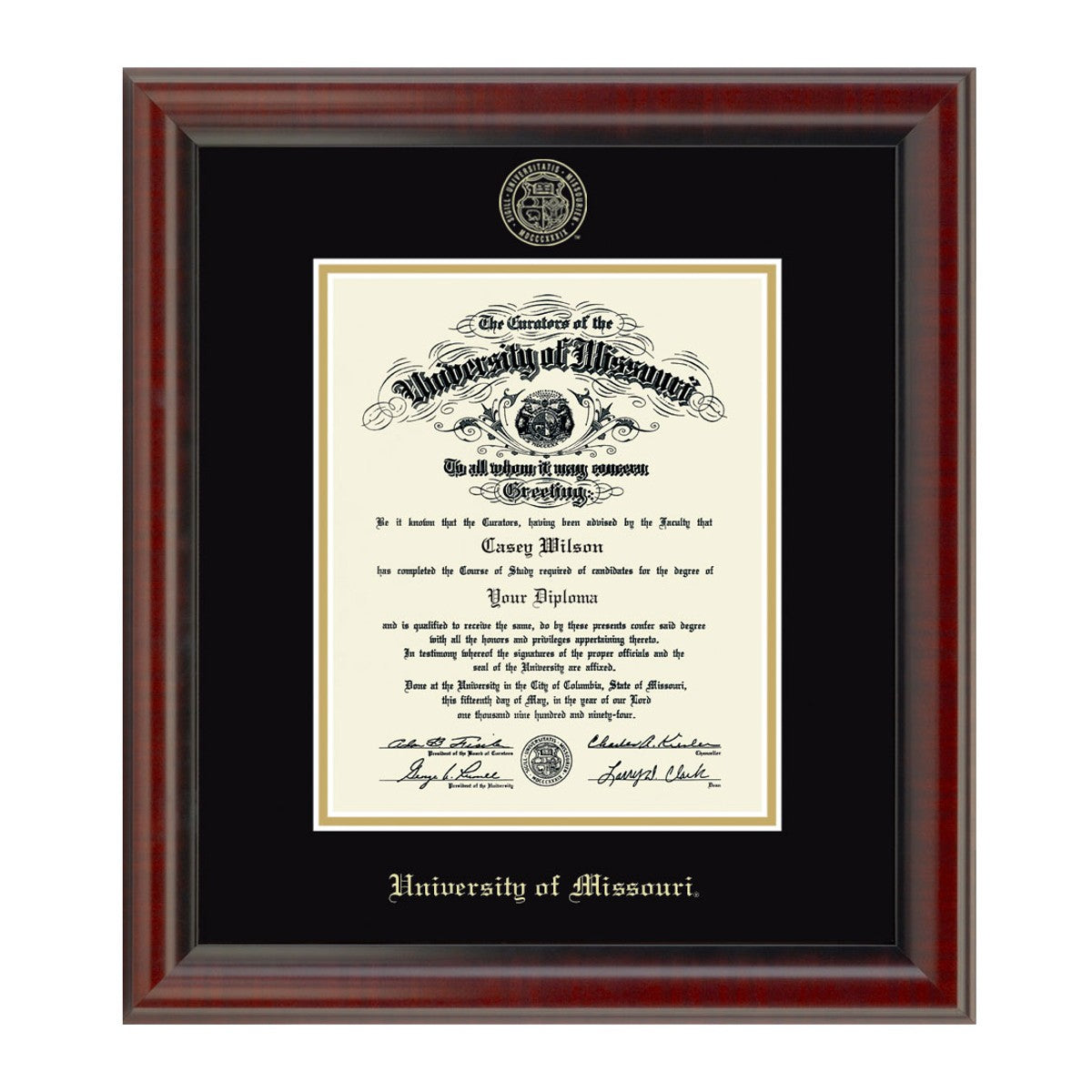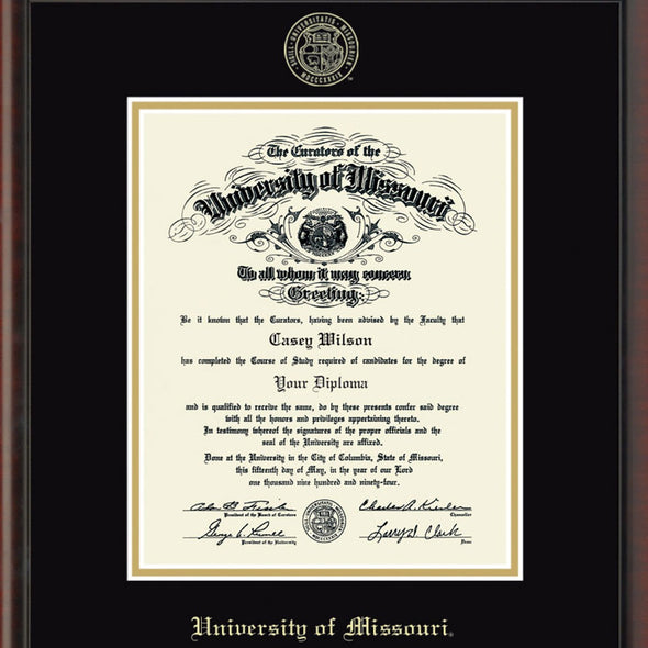 This University of Missouri Ph.D. diploma frame is crafted from solid wood in the USA. Proudly display your Missouri diploma with museum quality conservation mounting materials to showcase and protect your University of Missouri diploma.