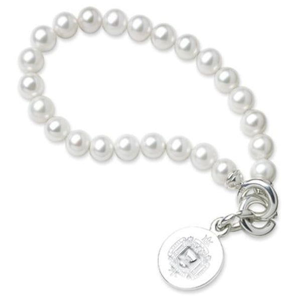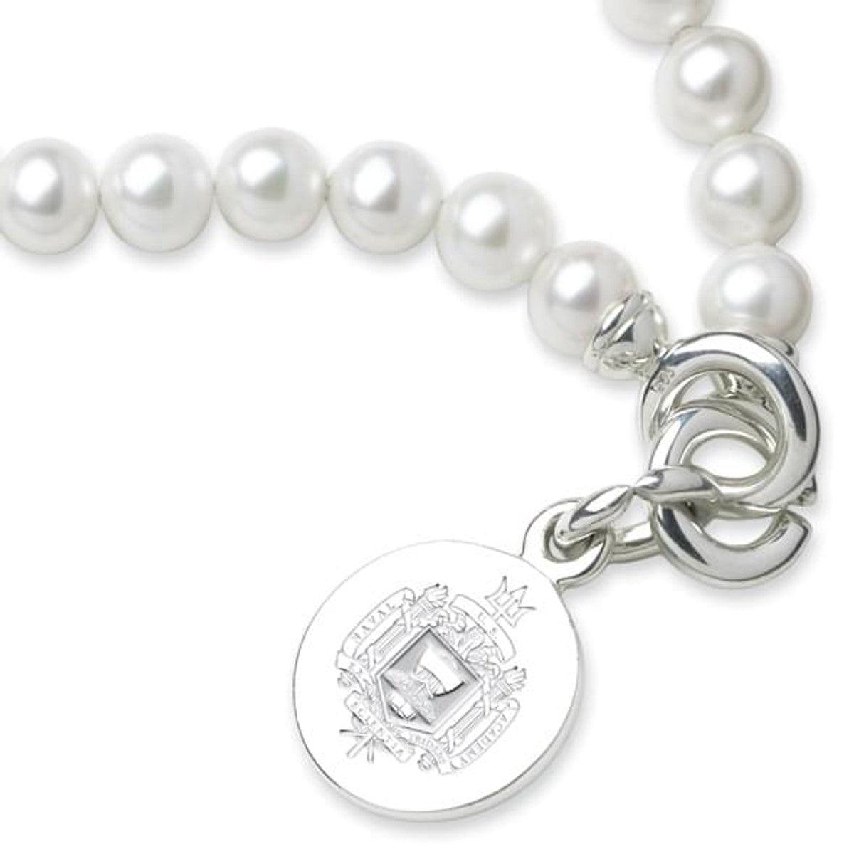 US Naval Academy pearl bracelet and sterling silver USNA charm features the USNA Logo delicately engraved on front and interlocking "C" clasp.